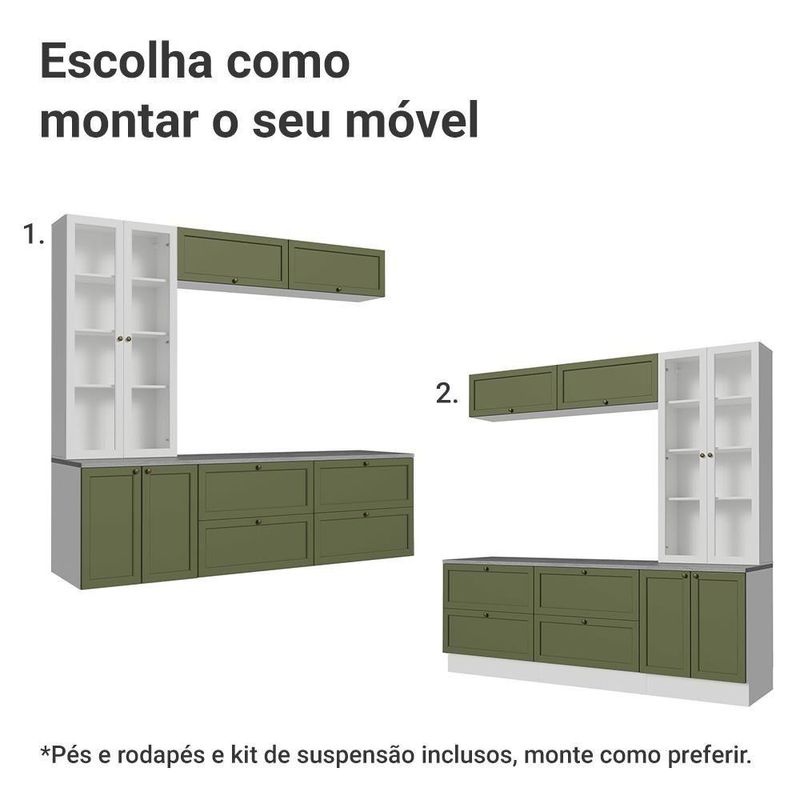 O conjunto é composto por gavetas e armários amplos, um armário com portas de vidro, que pode ser como cristaleira ou livreiro. Essa combinação permite acomodar uma , organizar livros, louças e itens decorativos com facilidade. O acabamento da estrutura é Branco, das frentes em Verde e da cristaleira em Branco também, possui alta resistência, trazendo um visual sofisticado e textura suave ao toque.