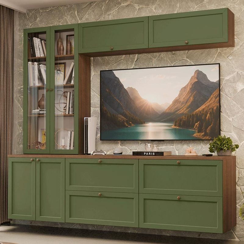 O conjunto é composto por gavetas e armários amplos, um armário com portas de vidro, que pode ser como cristaleira ou livreiro. Essa combinação permite acomodar uma , organizar livros, louças e itens decorativos com facilidade. O acabamento da estrutura é no tom amadeirado Rustic e das frentes em Verde, possui alta resistência, trazendo um visual sofisticado e textura suave ao toque.