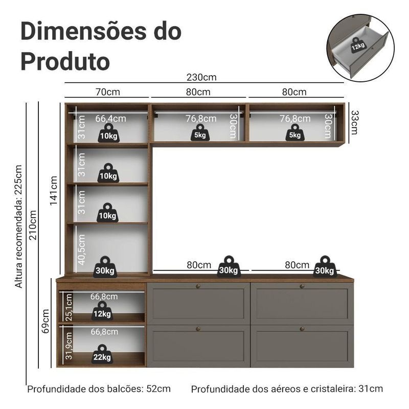 - 52cm de profundidade nos balcões e 31cm nos aéreos e cristaleira