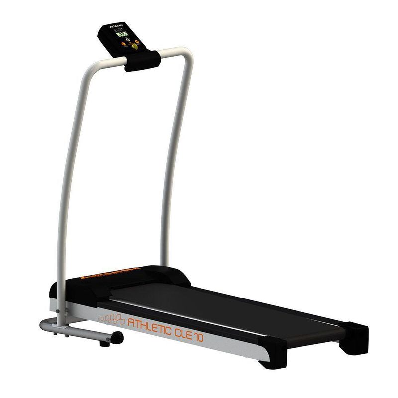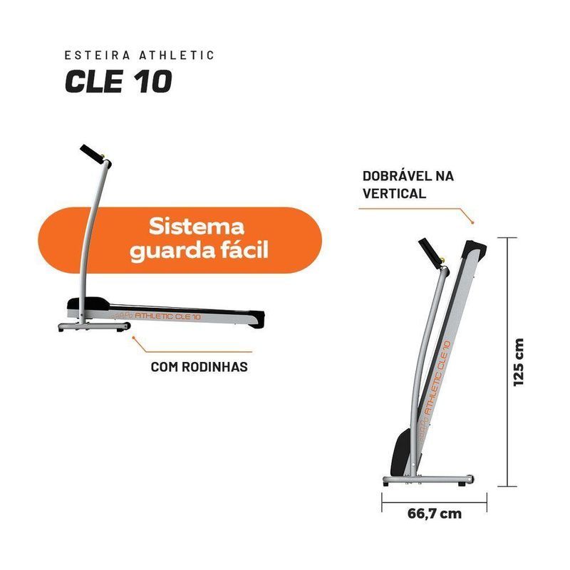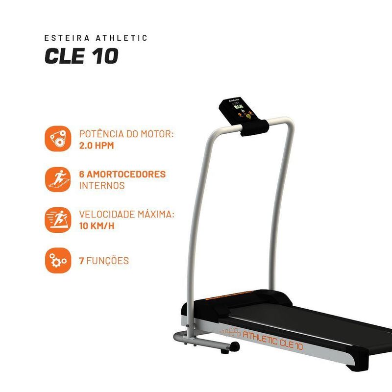 Transforme qualquer canto da sua casa em um espaço dedicado à saúde e ao bem-estar com a Esteira Ergométrica Athletic CLE 10. Se você busca uma esteira elétrica eficiente, compacta e repleta de funcionalidades para alcançar seus objetivos fitness em casa, a Athletic CLE 10 é a escolha ideal.Com uma velocidade máxima de 10 KM/H e um potente motor de HPM (Corrente Contínua DC), esta esteira permite que você realize desde caminhadas leves até trotes e corridas mais intensas, adaptando o treino perfeitamente ao seu ritmo e nível de condicionamento físico. É a ferramenta perfeita para , treino aeróbico e fortalecimento muscular das pernas, costas, abdominais e glúteos.Mantenha-se sempre informado sobre seu desempenho com o monitor intuitivo de 7 funções essenciais: Scan (alterna informações), Velocidade atual, Distância percorrida, Tempo de treino, Calorias queimadas, Odômetro (distância total) e Sleep. Acompanhar seu progresso é fundamental para manter a motivação e otimizar seus resultados.O conforto é um dos pontos fortes da Esteira Athletic CLE 10. Equipada com um avançado sistema de amortecimento com 6 amortecedores internos, tornando seus treinos mais agradáveis e seguros, e ainda minimiza o ruído, ideal para o ambiente residencial.Pensada para o lar moderno, esta esteira é dobrável e conta com o prático sistema guarda-fácil, ocupando um espaço mínimo quando não está em uso. As duas rodas dianteiras facilitam o pela casa. A estrutura em aço carbono com pintura eletrostática a pó e a plataforma em MaDeFibra BP de 15mm garantem maior qualidade e durabilidade.A Esteira Athletic CLE 10 foi projetada com foco na sua segurança. Possui chave de segurança para parada de emergência, lona antiderrapante e carenagem de proteção no motor. A lona é fácil de ajustar e a lubrificação é manual e de aplicação simples (manter a lubrificação em dia é crucial para a vida útil do equipamento).Comprometida com a sustentabilidade, a Athletic oferece um produto de baixo consumo de energia, contribuindo para um estilo de vida mais eco-friendly. E para sua total tranquilidade, a esteira conta com garantia de 1 ano e a conveniência da rede de assistência técnica Athletic. A montagem é fácil graças ao sistema easy fast.Escolha a Esteira Elétrica Athletic CLE 10 para transformar a sua casa em um espaço de exercício completo. Com velocidade de 1 a 10 km/h, capacidade de 100kg e voltagem Bivolt, ela é a parceira ideal para trilhar o caminho para um estilo de vida mais ativo e saudável. Adquira a sua agora!Benefícios