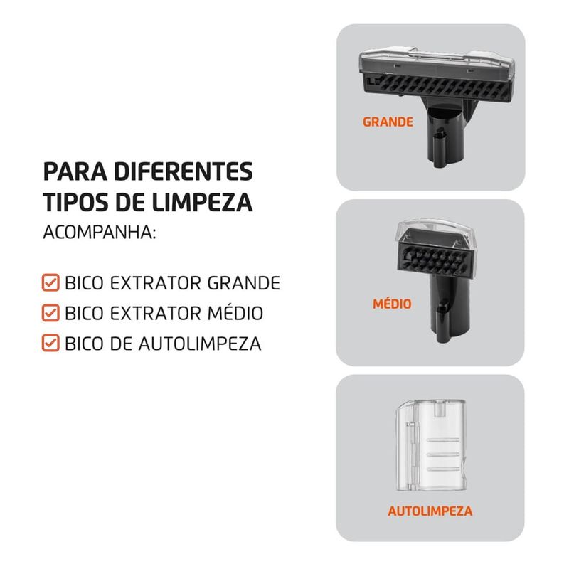 Para Diferentes Tipos de Limpeza: Inclui bico extrator grande, bico extrator médio e bico de autolimpeza para a higienização da mangueira. A Deep Cleaner II Mondial é perfeita para uso em carpetes, sofás, colchões, carros, tapetes e estofados.