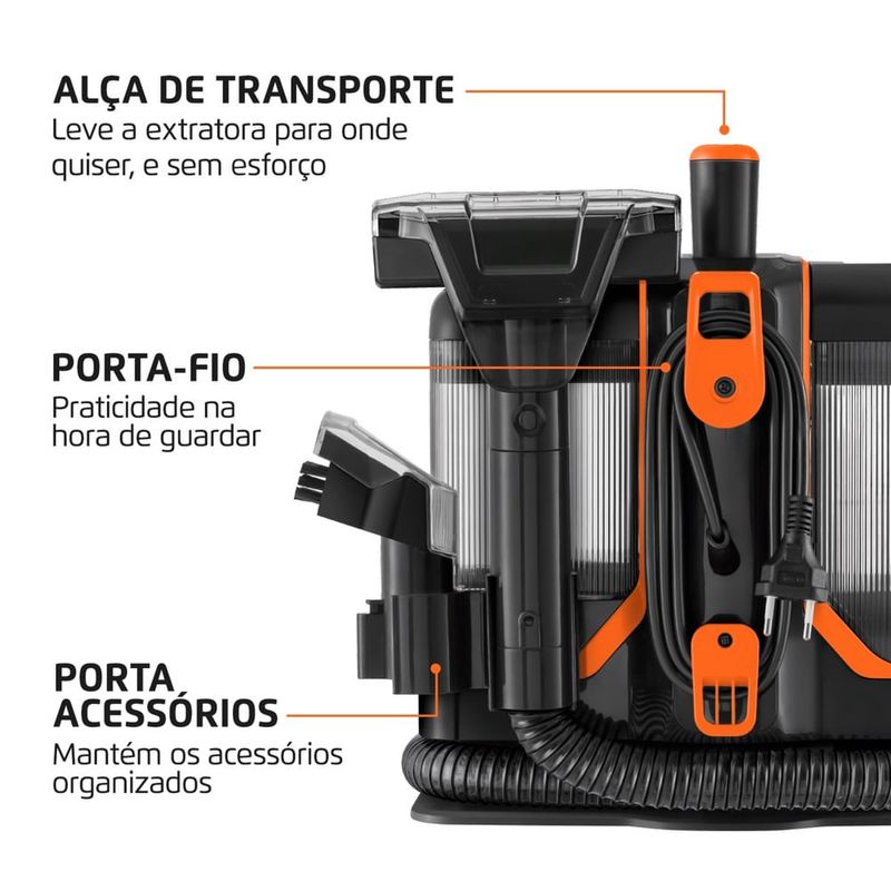 Potência de 1.800W: Com grande poder de sucção, a extratora portátil Mondial proporciona uma limpeza profunda e eficiente, removendo a sujeira com facilidade.