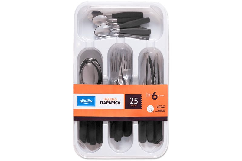 Colorida e informal, a linha Itaparica é perfeita para alegrar a sua mesa no dia a dia sem perder em qualidade e beleza. Feitas de aço inox polido e cabo em polipropileno, as peçam podem ir à máquina de lavar. As facas são temperadas, não danificando pratos de porcelana. Este faqueiro de 25 peças serve refeições para até seis pessoas, contendo garfos e colheres de mesa, facas de churrasco, garfos, colheres de chá e 1 gaveteiro. Para combinar com a decoração da sua cozinha, o conjunto está disponível em cinco cores: cinza, azul fog, branco, preto e vermelho bold.