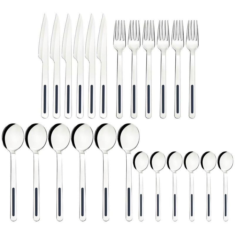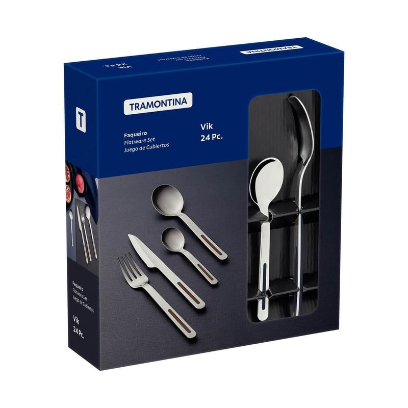 "Componha uma mesa encantadora e cheia de estilo para saborear suas refeições, com o faqueiro Tramontina Vik em aço inox com detalhes em polipropileno ônix 24 peças. Ideal para quem ama o estilo minimalista, ele tem peças desenvolvidas em aço inox com acabamento polido fosco e um lindo detalhe no cabo em polipropileno na cor ônix, que deixa o metal exposto na parte frontal e detalhe em polipropileno fica no verso. As peças podem ser levadas a máquina de lavar louças e as facas garantem durabilidade em seu fio de corte e maior resistência, já os garfos e colheres possuem estampagem e espessura especial. Escolha o faqueiro Tramontina Vik e proporcione uma experiência inesquecível a cada refeição!