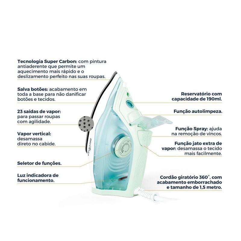 O Ferro de Passar Britânia BFV08 une tecnologia, agilidade e eficiência para facilitar sua rotina. Com base Super Carbon antiaderente, aquece até 57% mais rápido e desliza com facilidade sobre os tecidos.