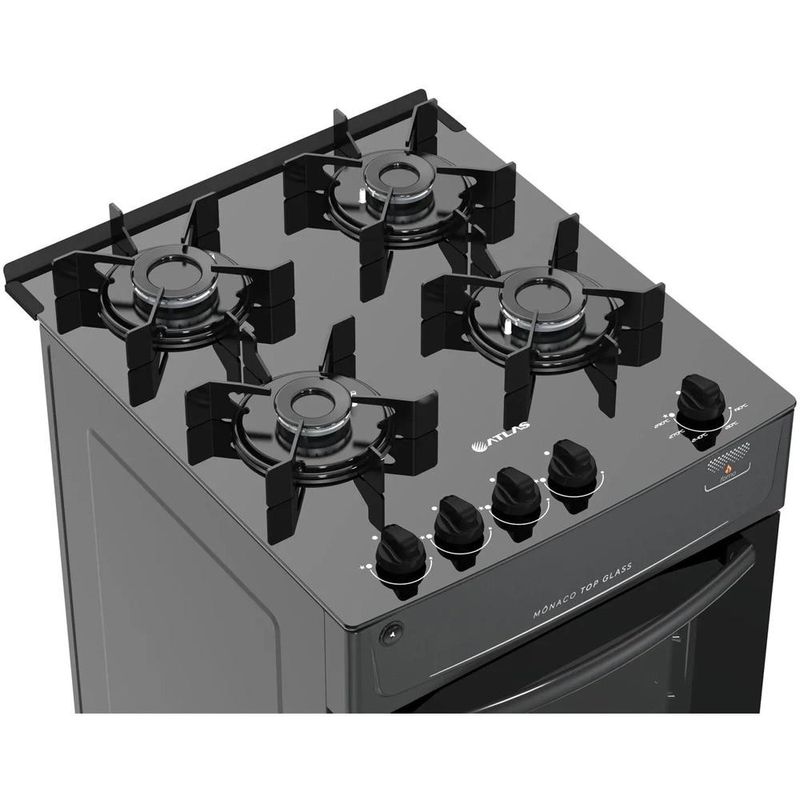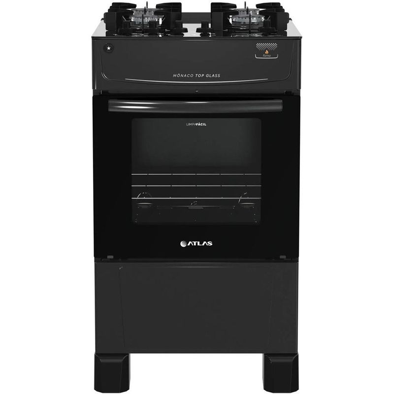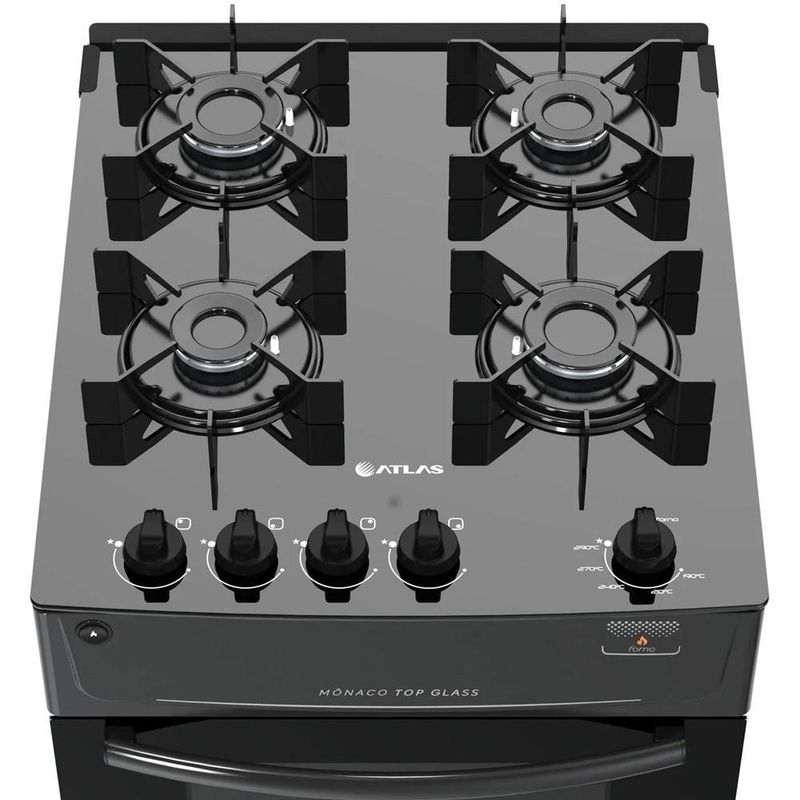 O Fogão Atlas Mônaco Top Glass combina design e inovação com soluções que aliam a elegância e funcionalidade para você e sua cozinha.  O fogão possui mesa de vidro temperado sem bordas, que dá um toque de sofisticação para o produto, além de facilitar a limpeza.   Oferece acendimento automático com controle gradual da chama, permitindo maior controle da potência e economia.  Além disso, as trempes individuais em aço esmaltado, são firmes, seguras e duráveis.  Também possui forno com capacidade de 50 litros, que ainda conta com acabamento Limpa Fácil e vidro duplo.    Características  Marca: Atlas  Modelo: Mônaco Top Glass  Queimadores: 4  Ref.: 300000708  Cor: Preto    Especificações  Material da mesa: Vidro Temperado  Acendimento Automático  2 Queimadores Ramal 1,7kW  2 Queimadores Ramal 2,0kW  Trempe: Individual em Aço Estmaltado com 6 pontos de apoio  Botões Removíveis  Volume do Forno: 50 Litros  Acabamento Limpa Fácil (Forno)  1 grade deslizante com 2 regulagens de altura  Vidro Duplo (Forno)  Temperatura do forno: 180 a 300ºC;  Sistema Bloqueia Gás    Itens Inclusos  01 Fogão    Alimentação  Tensão: Bivolt  Tipo de Gás: GLP*  Classificação INMETRO A    Dimensões  Tamanho do produto (LxAxP): 87,9 x 48,0 x 59,5 cm  22,9 Kg    Garantia: 12 meses    Atenção!  *O produto é produzido originalmente para uso de gás engarrafado (GLP). Para transformar o fogão para gás GN, recorra ao Posto da Rede de Serviços Autorizados ATLAS mais próximo, o qual é responsável pela referida transformação.