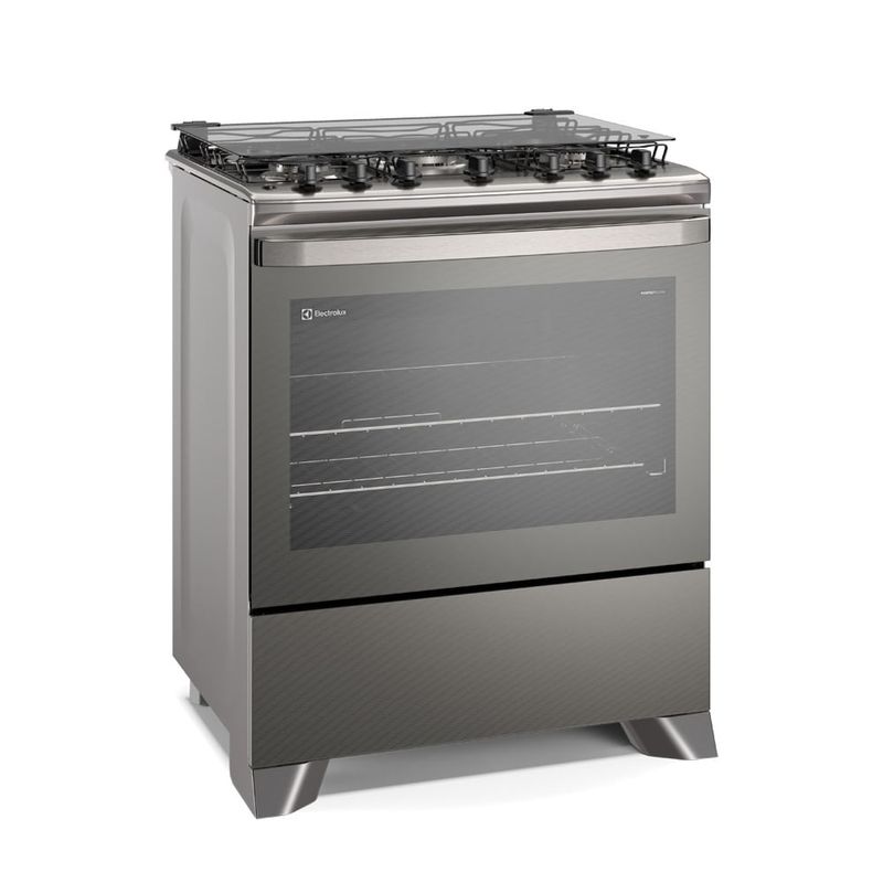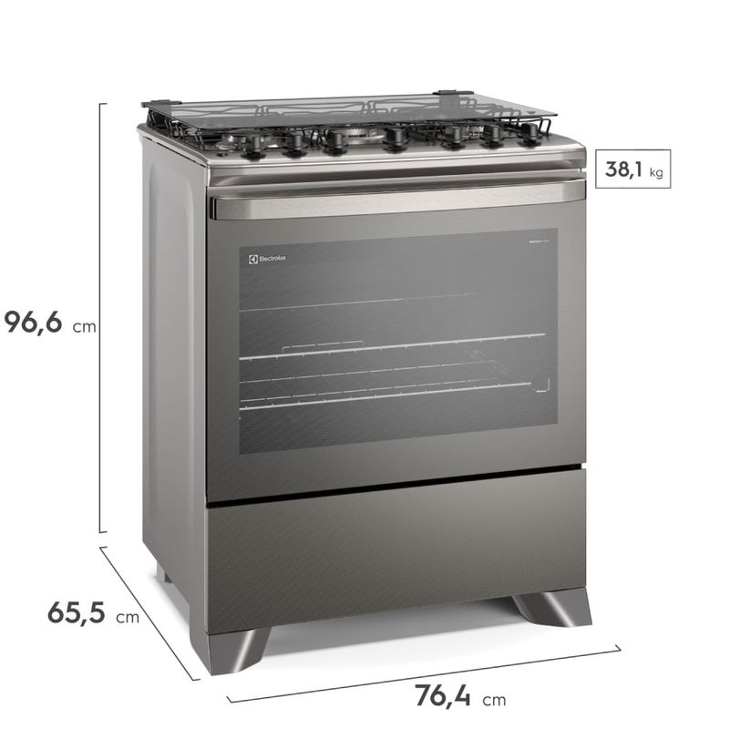 O fogão oferece um grande espaço para o preparo das suas receitas, com um forno de 108,9 litros de capacidade. Tudo isso com muita elegância para a sua cozinha com design robusto na cor cinza.