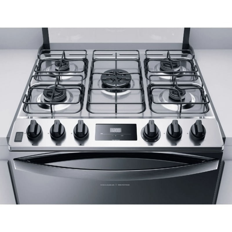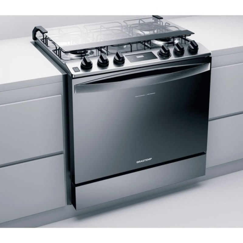 O fogão de embutir Brastemp 5 bocas cor Inox é moderno, robusto e fácil de usar. Além da mesa de aço inox, o fogão tem grades individuais, uma chama mais potente para preparos rápidos, a Turbo Chama, botões removíveis com aro protetor para evitar a entrada de sujeira e um espaçoso forno de 96 litros que conta com 2 prateleiras, uma de altura ajustável e outra autodeslizante. Para facilitar a limpeza, as paredes do forno são esmaltadas e o vidro interno da porta pode ser removido. Além disso, para ajudar a controlar o tempo de preparo das receitas, o timer emite um aviso sonoro ao final do tempo programado no painel digital.