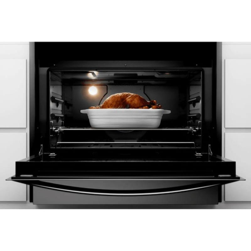 Ao abrir a porta do forno uma das prateleiras desliza automaticamente, facilitando a retirada dos alimentos
