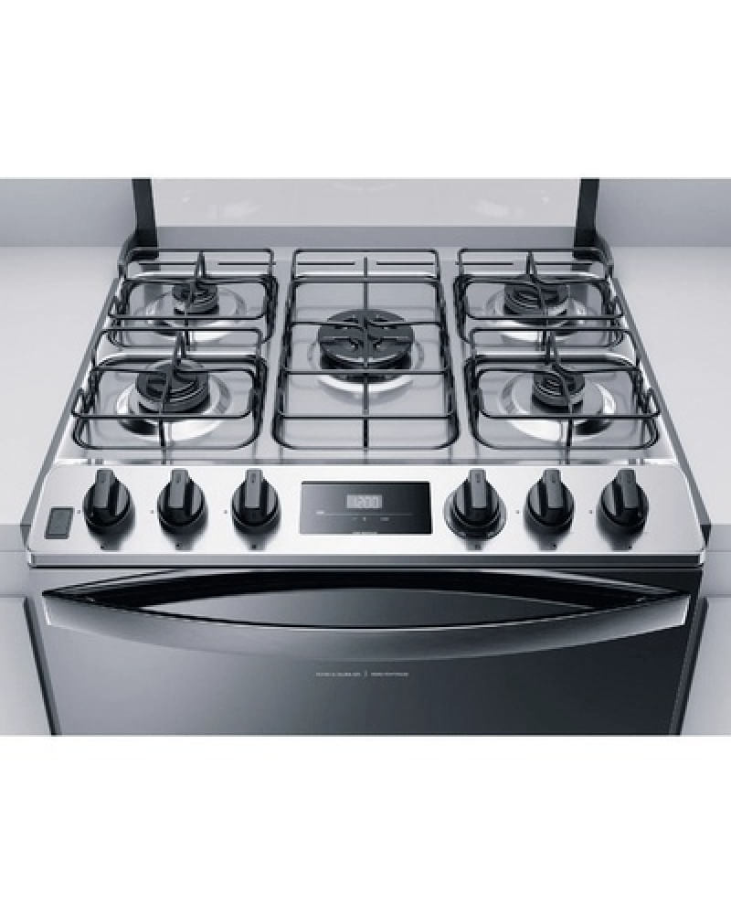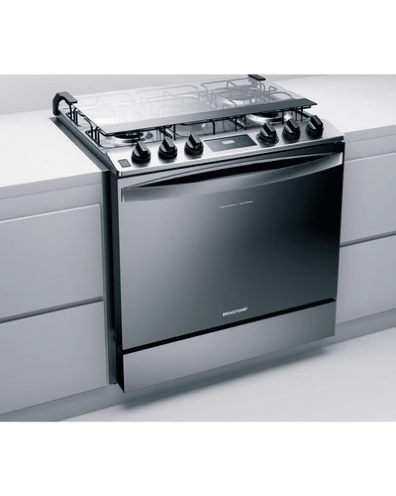 O fogão de embutir Brastemp 5 bocas cor Inox é moderno, robusto e fácil de usar. Além da mesa de aço inox, o fogão tem grades individuais, uma chama mais potente para preparos rápidos, a Turbo Chama, botões removíveis com aro protetor para evitar a entrada de sujeira e um espaçoso forno de 96 litros que conta com 2 prateleiras, uma de altura ajustável e outra autodeslizante. Para facilitar a limpeza, as paredes do forno são esmaltadas e o vidro interno da porta pode ser removido. Além disso, para ajudar a controlar o tempo de preparo das receitas, o timer emite um aviso sonoro ao final do tempo programado no painel digital.