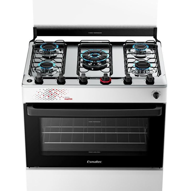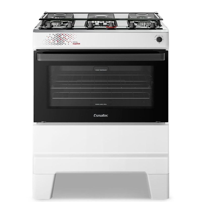 Acendimento automático: mais agilidade no uso.Mesa em aço inox: resistência e facilidade na limpeza.Tampão de vidro: estilo e praticidade para sua cozinha.Trempes duplas em aço esmaltado: estabilidade reforçada para as panelas.Timer mecânico: controle de tempo direto no painel.Forno Limpa Fácil com 84 litros de capacidade: mais espaço para grandes receitas.1 grade deslizante + 1 grade autodeslizante: mais praticidade e segurança no forno.Porta do forno em vidro total com vidro interno removível: limpeza e visual moderno.Pés altos e retos com encaixe fácil: estabilidade e limpeza facilitada.O Fogão 5 Bocas Esmaltec Ideal Master a Gás com Mesa Inox Branco é a escolha certa para quem precisa de mais espaço e desempenho na cozinha. A mesa em aço inox garante resistência ao uso diário e é fácil de limpar. Já o tampão de vidro agrega estilo, proteção e um acabamento mais elegante ao ambiente.Com acendimento automático, o uso é prático e seguro. Os queimadores bem distribuídos (3 família, 1 grande e 1 pequeno) oferecem flexibilidade para diferentes tipos de preparo, enquanto as trempes duplas em aço esmaltado garantem firmeza e durabilidade.O forno Limpa Fácil com 84 litros de capacidade acomoda receitas maiores e vem com porta em vidro total, vidro interno removível e duas grades (uma deslizante e uma autodeslizante), proporcionando mais praticidade e segurança no manuseio.O timer mecânico dá mais controle sobre o tempo de preparo, e os botões removíveis, puxador ergonômico e pés altos com encaixe fácil completam o conjunto com conforto, organização e funcionalidade.O Esmaltec Ideal Master 5 bocas branco a gás é ideal para quem valoriza um fogão espaçoso, confiável e com visual moderno.Isso é valor.Isso é Esmaltec.Quantidade de Bocas: 5 | Produto: Fogão | Alimentação: A gás | Mesa: Aço Inox | Acendimento automático: Sim | Voltagem: Bivolt | Tipo: De piso | Cor: Branco
