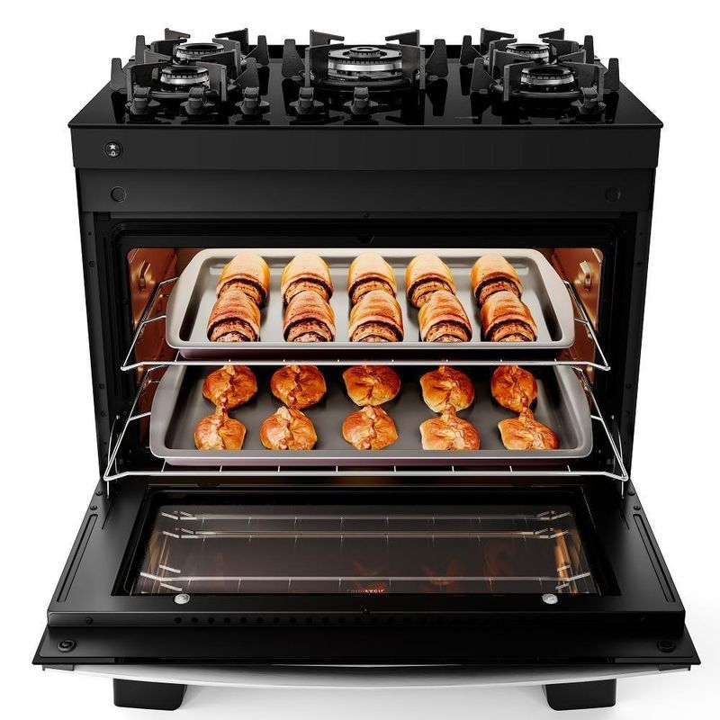 A mesa de vidro ultra resistente e o puxador em alumínio escovado, dão um toque de elegância à sua cozinha. Os pés altos e robustos proporcionam estabilidade e segurança durante o uso e facilitam a limpeza. E o visor amplo do forno oferece uma visão clara dos seus pratos em preparo. As grades de ferro fundido são um destaque no Agile Up, combinando estilo e resistência. Além de proporcionarem um visual único, essas grades foram projetadas para suportar panelas de diferentes tamanhos, garantindo estabilidade. A potência é uma característica essencial em qualquer fogão. O Agile Up vai além ao oferecer queimadores forjados, que garantem um desempenho superior e uma distribuição de calor uniforme. Além disso, a versão com 5 queimadores ainda conta com Tripla Chama para você preparar qualquer receita ainda mais rápido. Para maior praticidade, o fogão de inox possui 2 prateleiras deslizantes, permitindo que você ajuste facilmente a posição dos alimentos dentro do forno. Com a lâmpada do forno, você poderá visualizar seus pratos com clareza e verificar seu cozimento sem precisar abrir a porta do forno, economizando energia e mantendo a temperatura interna estável. O Fogão Agile Up é perfeito para famílias que querem uma cozinha renovada e bonita para receber pessoas queridas. Um produto prático, moderno e durável, que combina com seu dia a dia e estilo. Tudo isso, com o selo de mais de 70 anos de qualidade Atlas. A versão 5 bocas conta com 2 queimadores semirrápido de 1,67kW, 2 queimadores rápido de 2,0kW, 1 queimador Tripla Chama de 3,3kW e forno com capacidade de 86,5 litros.