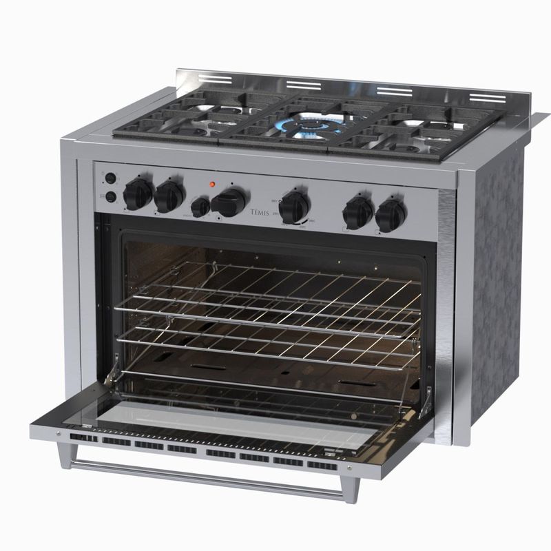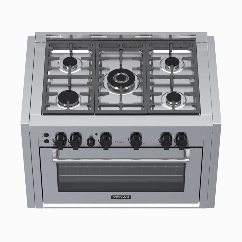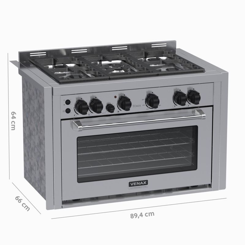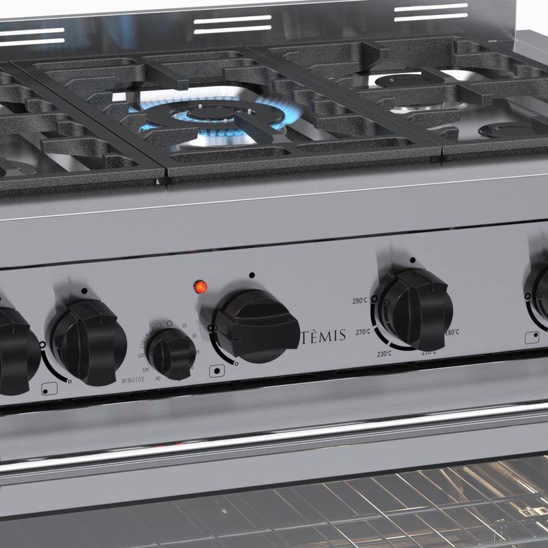 Fogão de Embutir 5 Bocas Têmis, com Acendimento Automático Total, Visor na Porta do Forno, Tripla Chama Central, Trempes Duplas de Ferro Fundidos, Mesa de Inox, Luz no Forno, Puxador na Porta do Forno em Aço Cromado, Porta Removível, Grill Dourador no Forno com Timer, Duas Grades Deslizantes no Forno, Bandeja Coletora de Gordura no Forno, Dois Espetos Giratórios, Forno Easy Clean.