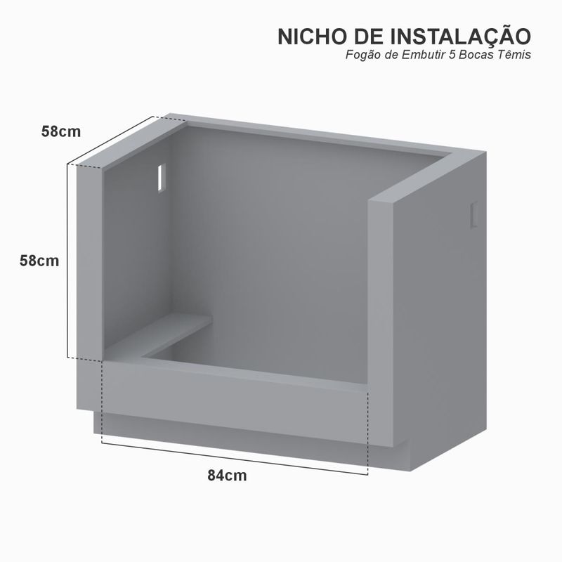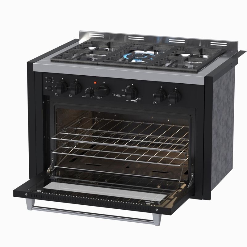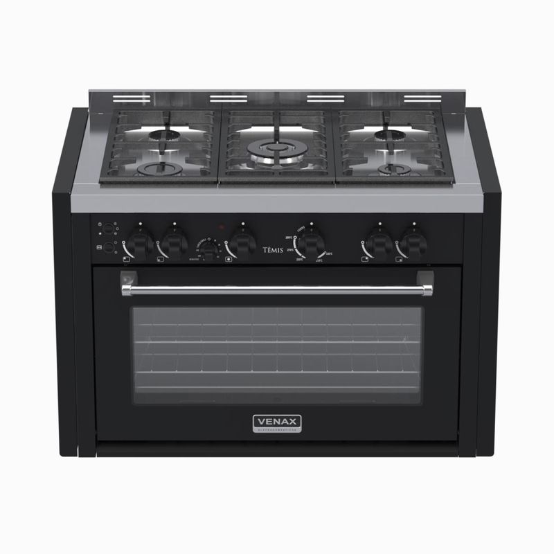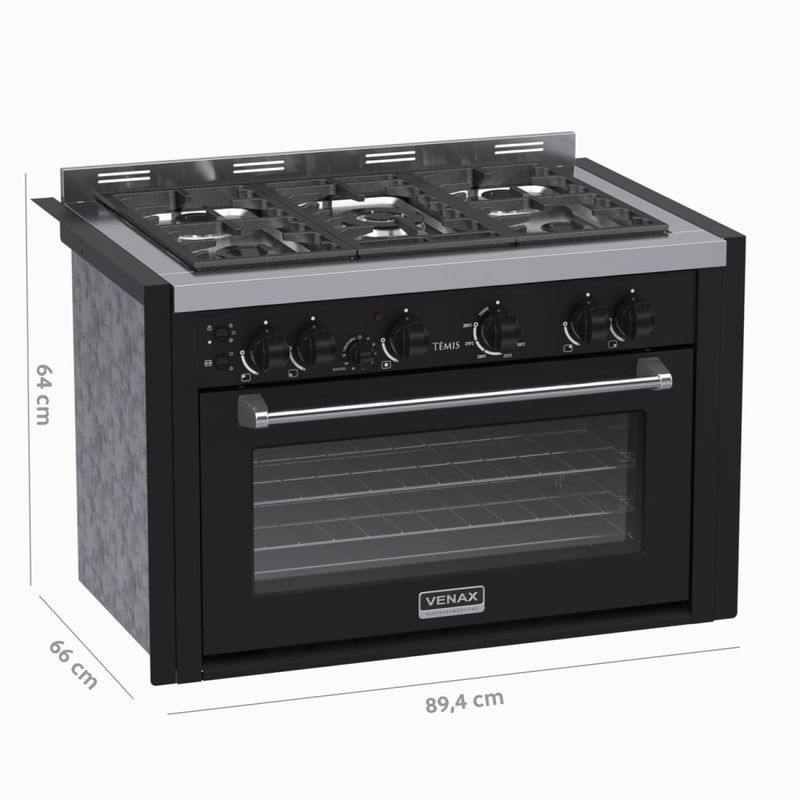 Fogão de Embutir 5 Bocas Têmis, com Acendimento Automático Total, Visor na Porta do Forno, Tripla Chama Central, Trempes Duplas de Ferro Fundidos, Mesa de Inox, Luz no Forno, Puxador na Porta do Forno em Aço Cromado, Porta Removível, Grill Dourador no Forno com Timer, Duas Grades Deslizantes no Forno, Bandeja Coletora de Gordura no Forno, Dois Espetos Giratórios, Forno Easy Clean.