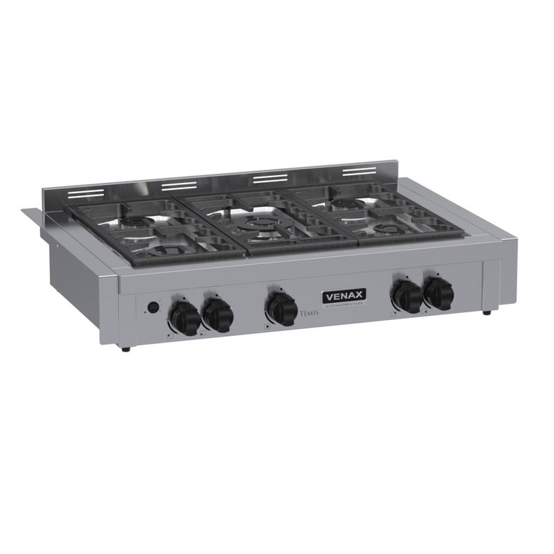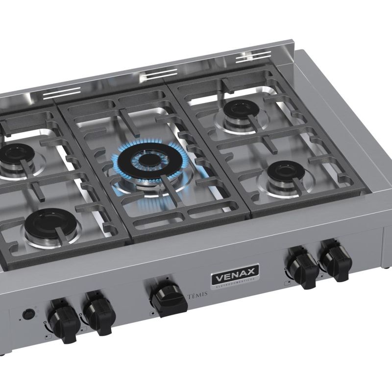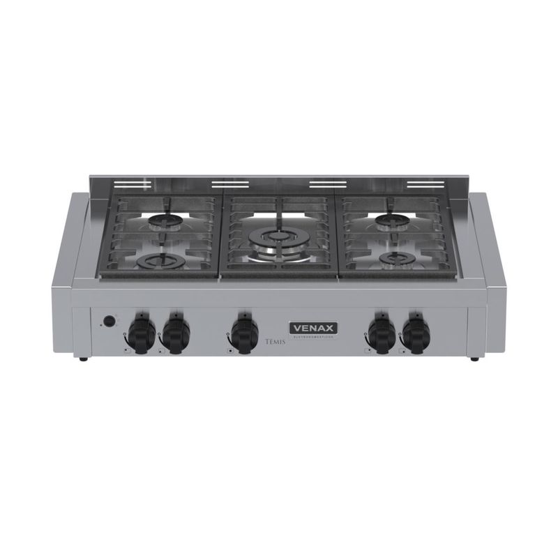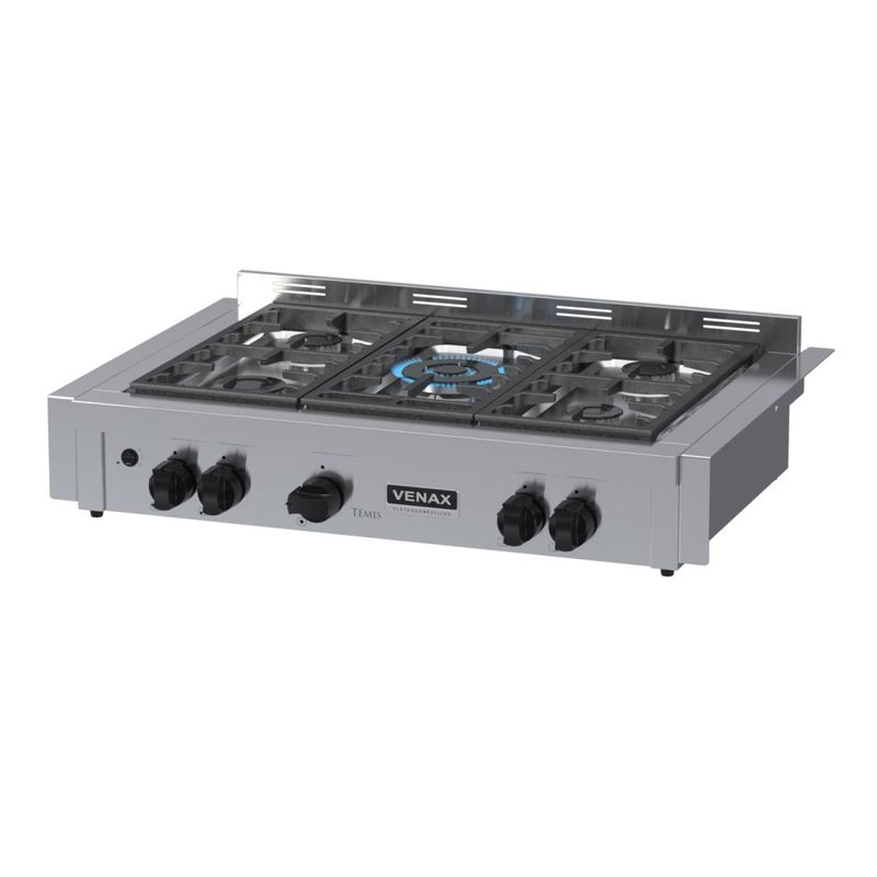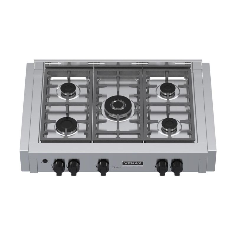 Fogão de Mesa de Embutir 5 Bocas Têmis, com Acendimento Automático Total, Queimador Central Tripla chama, Trempes Duplas de Ferro Fundido, Mesa em Inox e Queimadores Estilo Italiano, Respaldo em Inox.