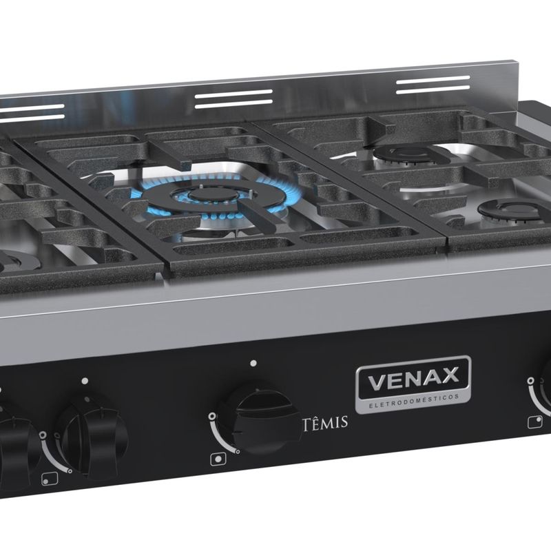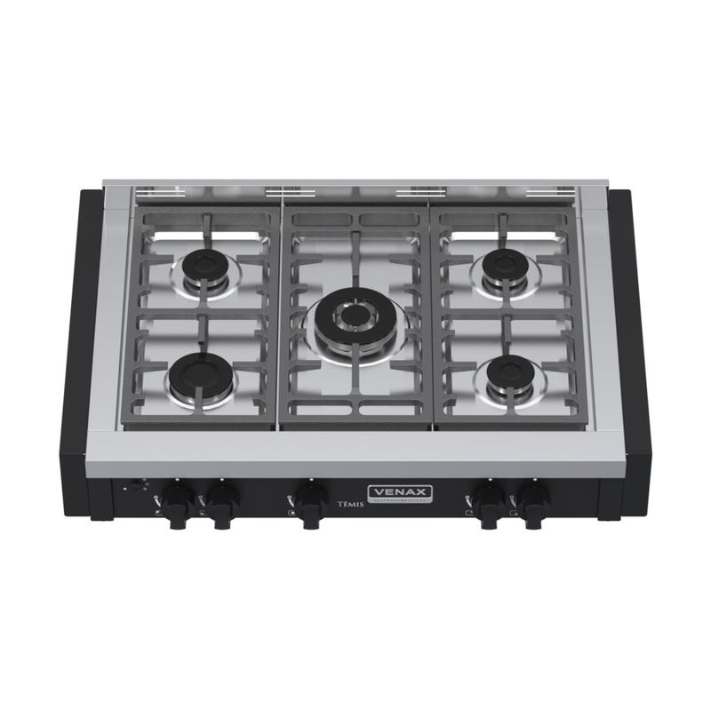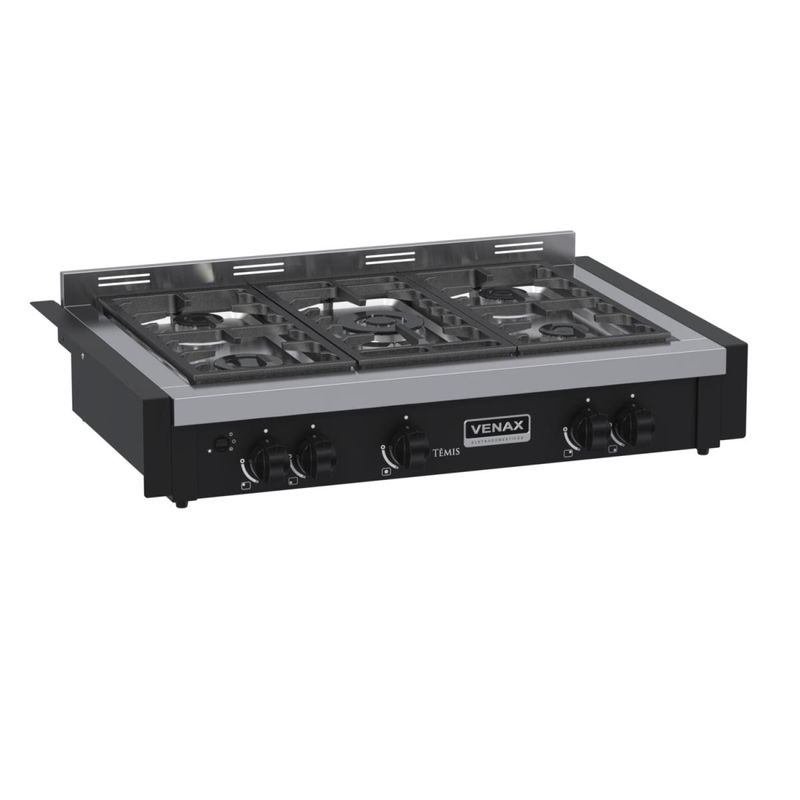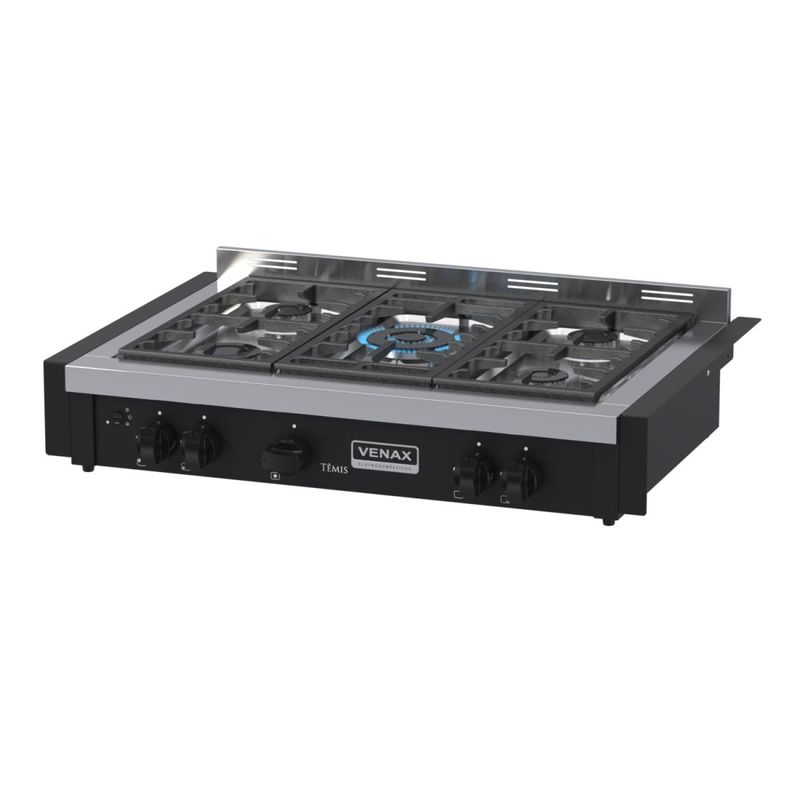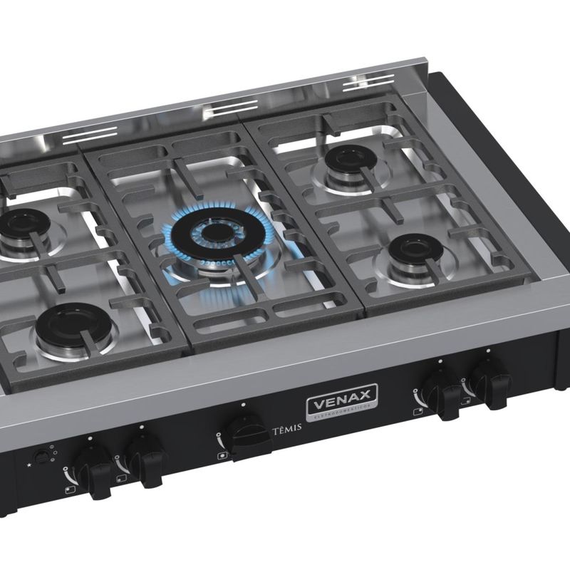 Fogão de Mesa de Embutir 5 Bocas Têmis, com Acendimento Automático Total, Queimador Central Tripla chama, Trempes Duplas de Ferro Fundido, Mesa em Inox e Queimadores Estilo Italiano, Respaldo em Inox.
