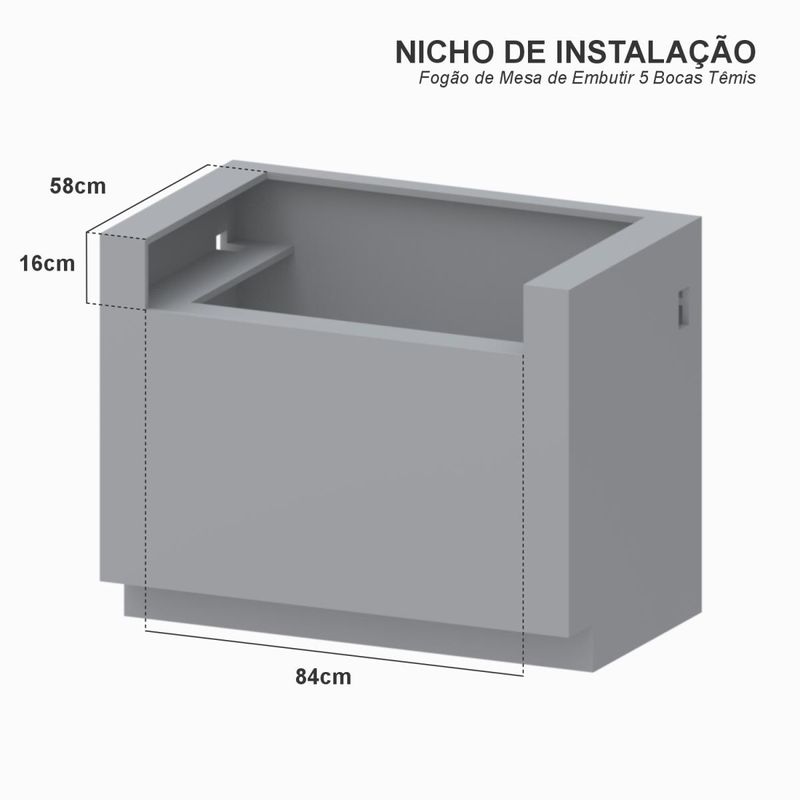Fogão de Mesa de Embutir 5 Bocas Têmis, com Acendimento Automático Total, Queimador Central Tripla chama, Trempes Duplas de Ferro Fundido, Mesa em Inox e Queimadores Estilo Italiano, Respaldo em Inox.