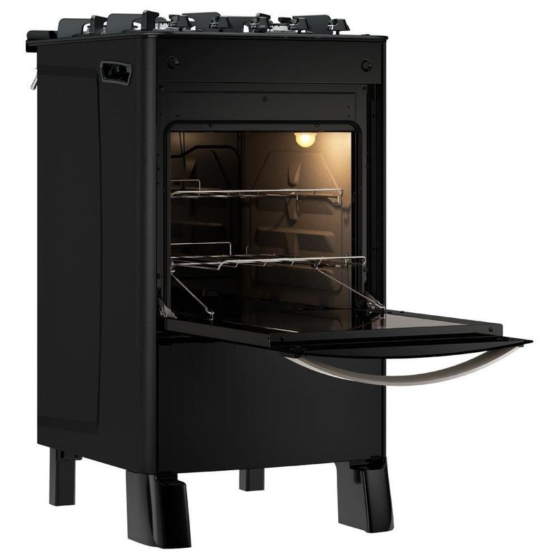 1 ajustável e 1 auto deslizante.Luz no forno Cor: Preto | Tipo de Fogão: Piso | Tipo de Mesa: Vidro | Quantidade de Bocas: 4 | Tipo de acendimento: Automático | Tipo de Alimentação: GLP | Voltagem: Bivolt