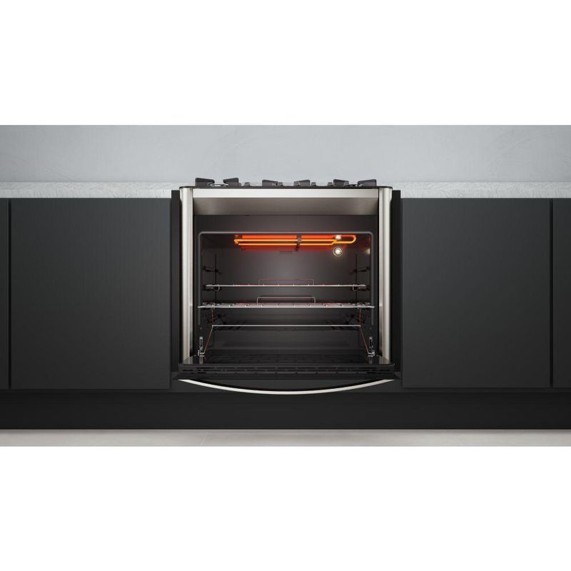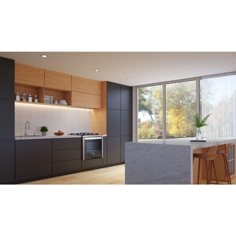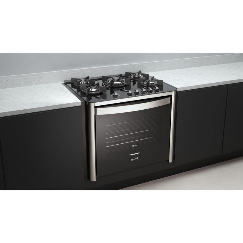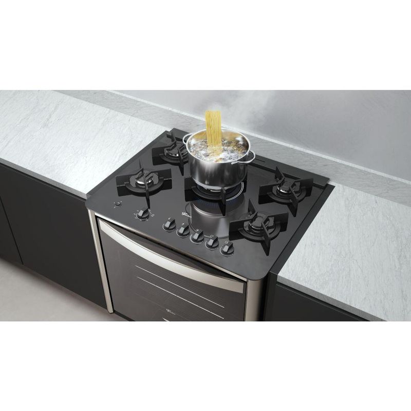 - Acabamento: Mesa de vidro temperado na cor preta; Suporte da trempe esmaltado em easy clean preto; Trempe individual; Manipuladores (botões) na cor preto removíveis; Fogão com 5 queimadores: 1 queimador tripla chama ( 3750W) 1 queimador rápido (2850W), 3 queimadores semirrápidos (1950W); Forno com 1 queimador (3500W); Potência elétrica grill/dourador: 1000W; Puxador em alumínio escovado anodizado; Laterais em aço pintado silver; Porta com vidro duplo serigrafado e amplo visor; Perfil frontal em aço pintado silver; Resistência interna do forno blindada; 2 Grades cromadas, ajustáveis, deslizantes e removíveis; Bandeja esmaltada para resíduos - removível; Corpo interno com revestimento especial easy clean de fácil limpeza.