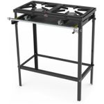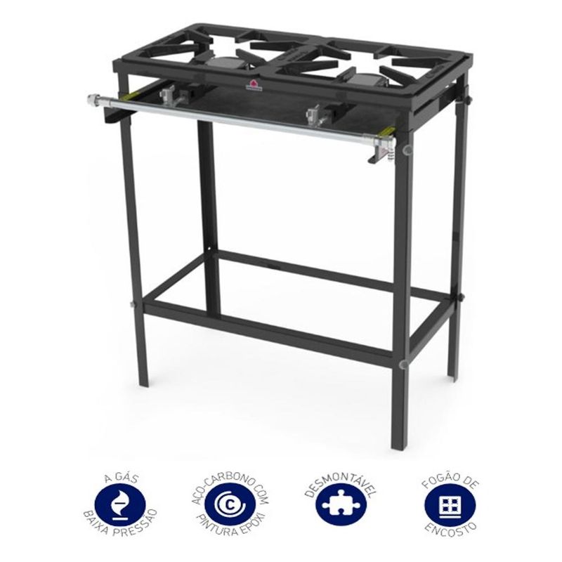 Um fogão com 2 bocas com coletor de gordura. Além de estrutura em aço com acabamento em pintura epóxi na cor preta, desmontável.