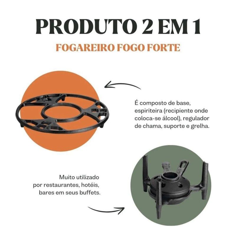 Fogareiro Fogo Forte com Aparador 24 cm Ferro Fundido Panela MineiraO Fogareiro Fogo Forte Com Aparador da Panela Mineira é composto de base, espiriteira (recipiente onde coloca-se álcool), regulador de chama, suporte e grelha. Sobre esse fogareiro pode-se colocar panelas e utensílios de ferro de diversos modelos e tamanhos, assim mantendo o alimento quente. Muito utilizado por restaurantes, hotéis, bares em seus buffets.Fogareiro Fogo Forte com Aparador 24 cm Ferro Fundido Panela Mineira - Especificações TécnicasMaterial: Ferro Fundido.Diâmetro: 24 cm.Peso: 2,3 kg.
