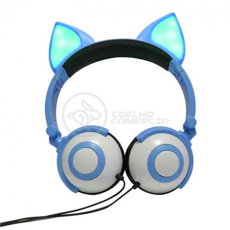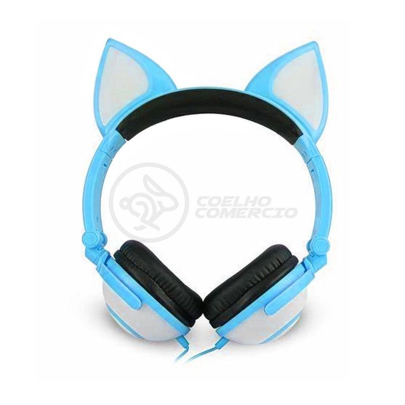 Fone De Ouvido Gatinho Fox Fio Com Led Orelha Gato Dobrável Infantil Microfone - Azul