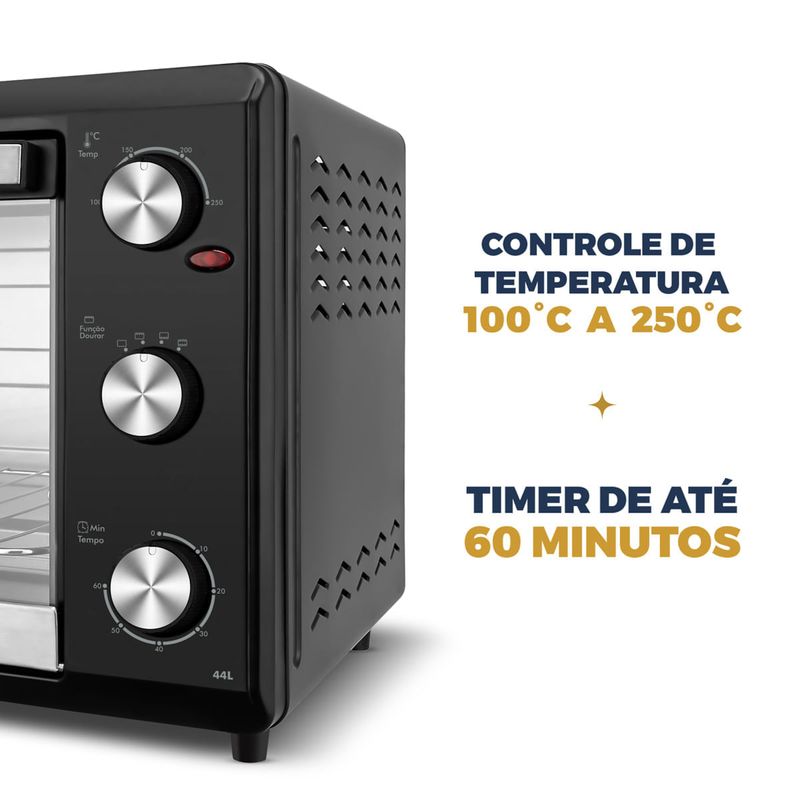 Além disso, ele tem dupla resistência, ou seja, escolha a resistência inferior, superior ou ambas, desse modo facilita para que os alimentos não queimem ou fiquem crus.