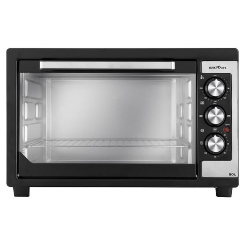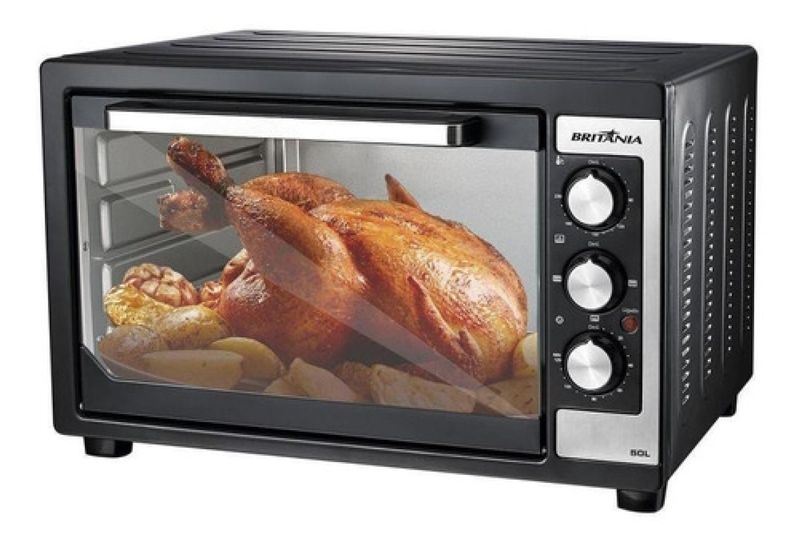 O Forno Elétrico Britânia 50L aquece, assa, tosta, gratina, grelha e descongela, ideal para você que ama cozinhar com praticidade e sabor! Possui 2 resisitências , superior e inferior, controle de temperatura, possui também função grill para deixar seus assados bem douradinhos. Com o forno Britania 50 litros gigante sua receita não queima, poque ele possui timer de 120 mim com desligamento automático, ele vai te avisar no tempo que você programar.
