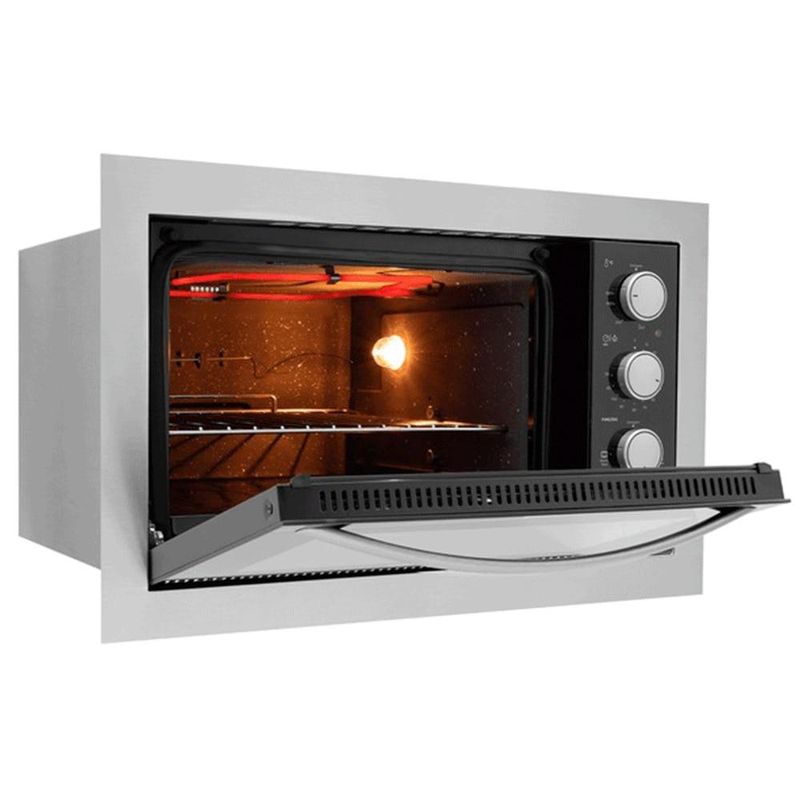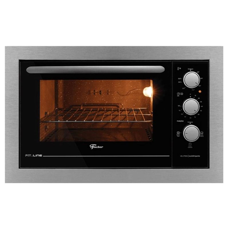 Características: Marca: Fischer Modelo: 34493 Cor: Inox Especificações: Capacidade interno do forno: 44 litros Grill/Dourado Lâmpada: Sim Funcionamento: Elétrico Painel: Eletromecânico Função turbo: Não Grade interna do forno: 1 grade cromada Bandeja coletora para resíduos Instalação gratuita: Não Vidro da porta: Duplo Função dourador: Sim Corpo interno com revestimento especial autolimpante Termostato automático de 50ºC a 320ºC; Timer de até 120 minutos com aviso sonoro Controle automático de temperatura Seletor de funções Funções: Aquec. Total, Aquec. Inferno, Aquec. Superior
