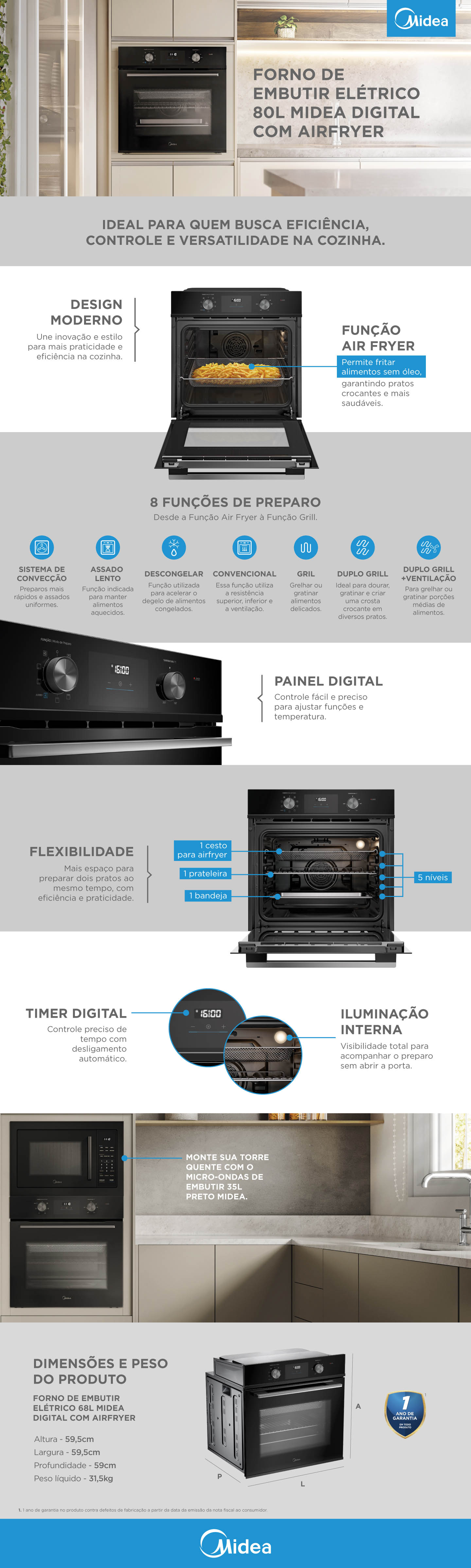 Forno Elétrico de Embutir Midea 80L Digital com Air fryer TSD80P2 220V