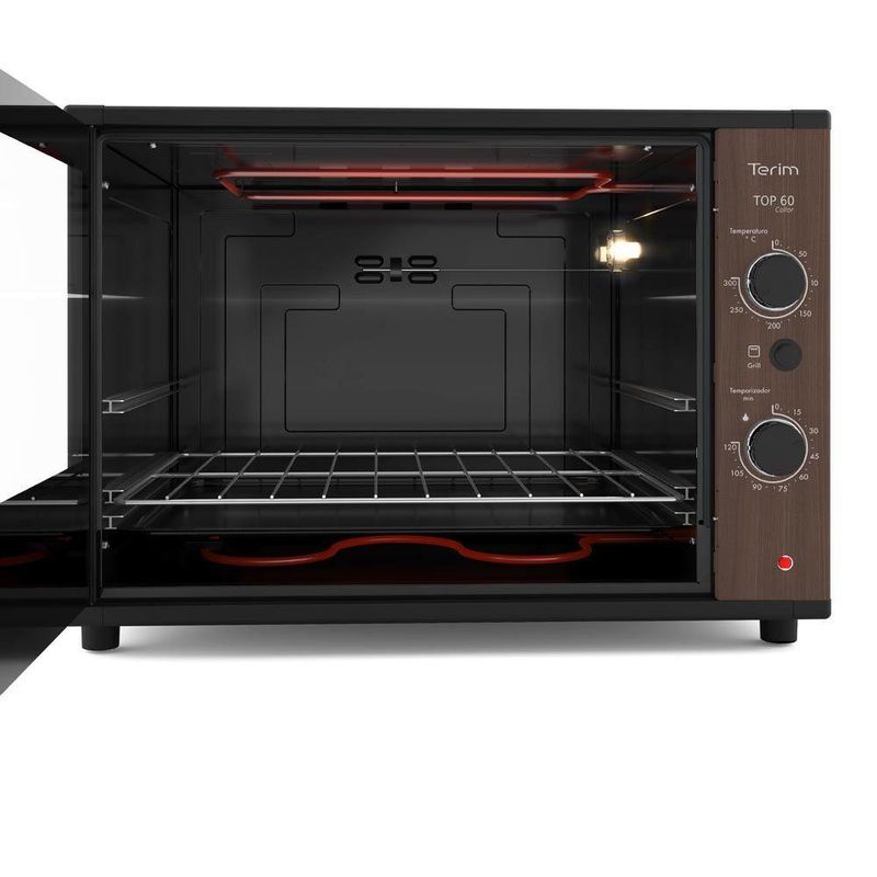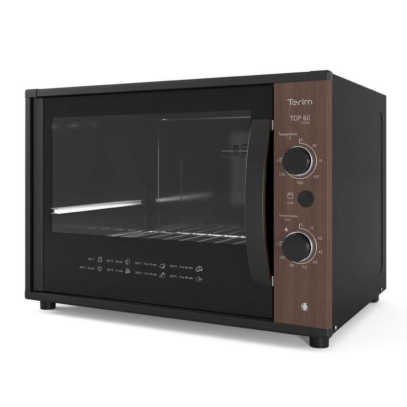 Quando o assunto e praticidade e inovação, nos temos a solução. Lancamento Forno Elétrico Terim TOP 60 Collor Madeirado Canela. O modelo incorpora um design diferenciado, com painel em 6 opcoes de cores vibrantes: Vermelho Marsala, Laranja Damasco, Azul Anis, Amarelo Curry e nas opcoes madeirado Canela ou Jatoba! Alem do design diferenciado a limpeza ficou muito mais rápida e fácil com o seu interior Easy Clean. Sem contar na economia por nao necessitar do uso de produtos abrasivos. O controle ideal de temperatura pode ser ajustado em ate 300 graus e o timer em ate 120 min. Para melhor acompanhamento do preparo este produto tambem conta com opcao de Grill e Luz interna. Facilitamos o manuseio em colocar ou retirar recipientes no interior do forno com a grade e a bandeja removiveis. Terim, tornando sua vida mais pratica!Caracteristicas:-Capacidade 60 Litros
