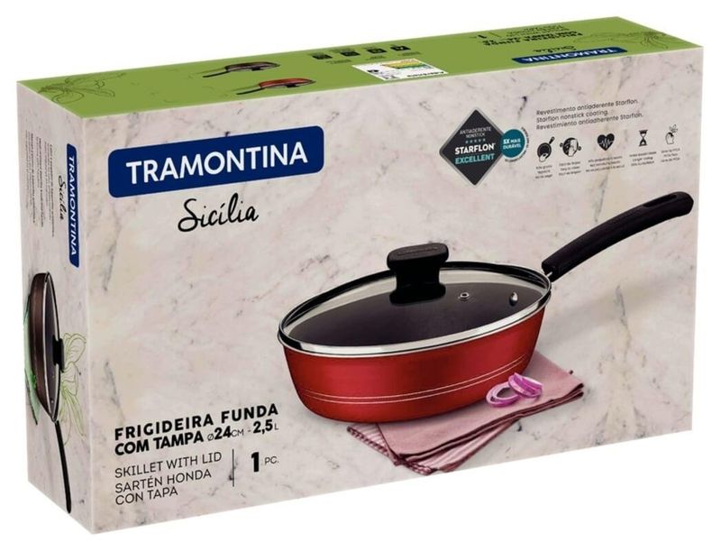 Leve a frigideira funda Tramontina com tampa Sicília em alumínio com revestimento interno e externo em antiaderente Starflon Excellent vermelho 24 centímetros de diâmetro 2,5 litros para sua cozinha e veja sua rotina ser transformada. Desenvolvida com corpo em alumínio com revestimento antiaderente Starflon Excellent, ela é indispensável para preparar frituras de imersão. Ela cozinha os alimentos de maneira uniforme, evita que eles grudem em sua superfície e devido a isso, é também muito fácil de limpar. Seu cabo foi desenvolvido em baquelite antitérmico, material que não aquece e proporciona um manuseio muito mais confortável e seguro. Ela ainda é fácil de limpar e pode ir à máquina de lavar louças, otimizando suas tarefas na cozinha!Recomendações de Uso:A capacidade volumétrica máxima para cozimento é de 3/4 da capacidade total da peça.