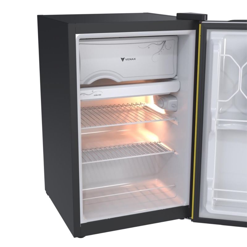 Frigobar NGV 10 Venax, com Capacidade Total de 82 Litros, Sendo 70 Litros no Refrigerador e 12 Litros no Congelador. Controle de Temperatura de 0°C a 5°C, Iluminação Interna e Porta-Latas Inteligente. Duas Prateleiras e Sistema de Refrigeração por Compressor.