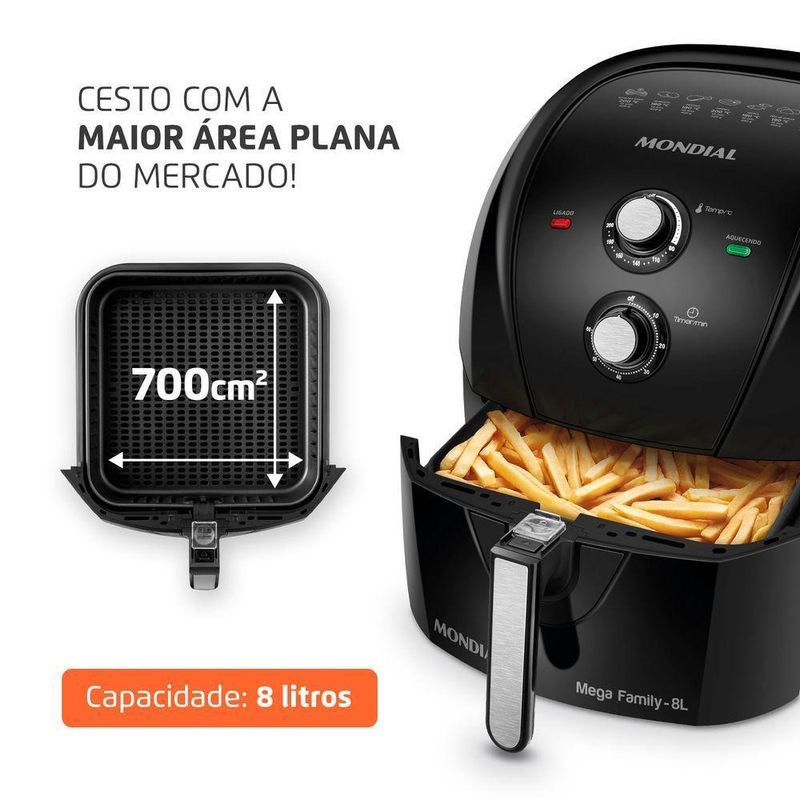 CAPACIDADE: 8 LITROS: A família de Air Fryers Mondial continua crescendo! O cesto quadrado com 700cm² tem a maior área plana do mercado e acomoda melhor os alimentos, permitindo preparar grandes porções, sem empilhar a comida e assando por igual.