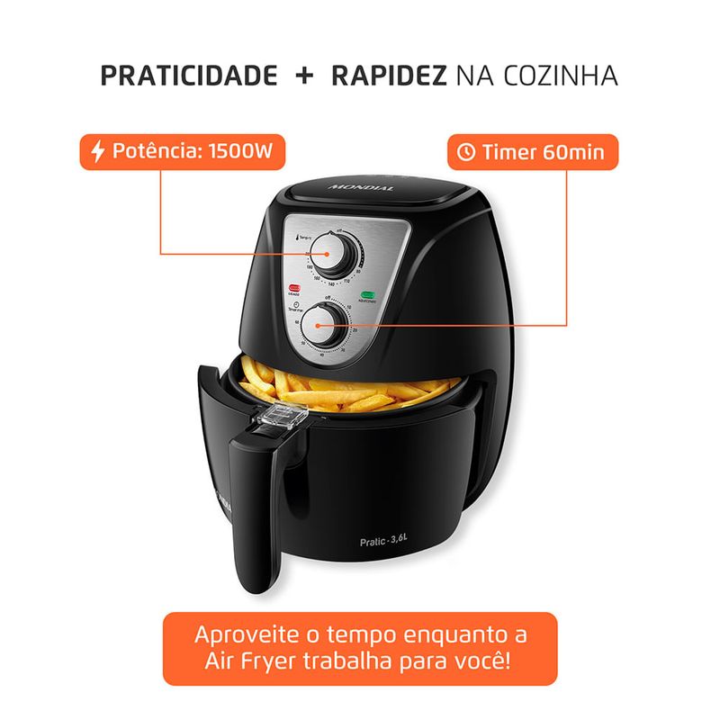 Acrescente praticidade e saúde à sua rotina diária com a Air Fryer Mondial AF-36-BI. A Tecnologia de Circulação de Ar Quente cozinha, frita (a ar), assa e tosta os alimentos sem precisar adicionar óleo ou manteiga. Além disso, a alta potência proporciona rapidez no preparo das receitas. A Air Fryer possui capacidade de 3,6 litros e o cesto é revestido com antiaderente Duraflon, e os alimentos não grudam no fundo. Saiba mais sobre a AF-36-BI: