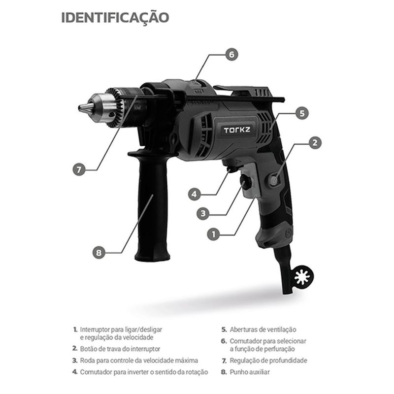 Especificações:   Indicação de uso: A ferramenta é determinada para furar com impacto em tijolos, betão e pedras assim como para furar em madeira, metal, cerâmica e plástico.  Botão comutador para perfurações com e sem impacto  Função reverso  Velocidade variável e trava para o gatilho  Design ergonômico com cabo emborrachado  Aplicações: Ideal para cortes, desbastes, remoções em metais, aplicações em alvenaria e concreto.  Funções: Perfuração com e sem impacto  Velocidade de rotação 2.600rpm  Taxa de impacto 41.600bpm   Mandril 13mm  Material: Alumínio, borracha e plástico ABS  Capacidade de Perfuração  Capacidade de perfuração no ferro: 13mm  Capacidade de perfuração no concreto: 13mm  Capacidade de perfuração na madeira: 25mm