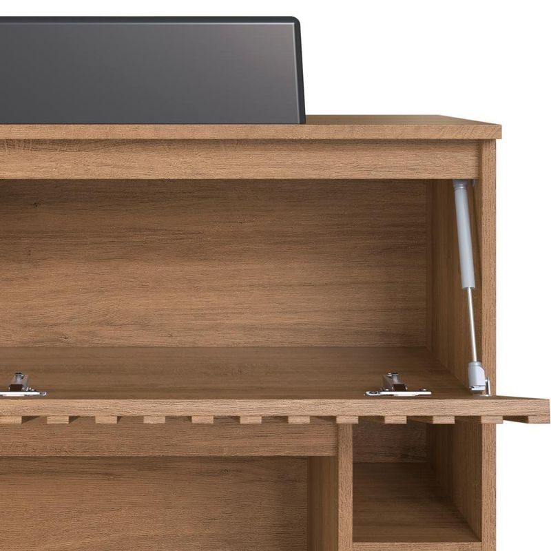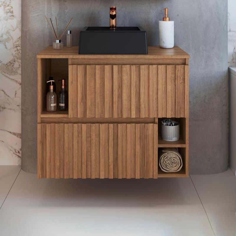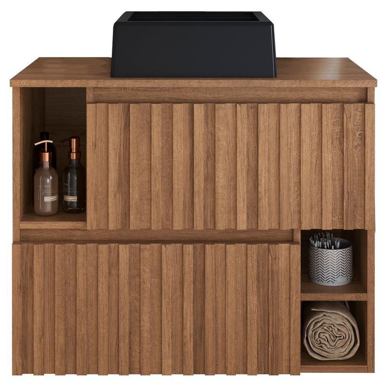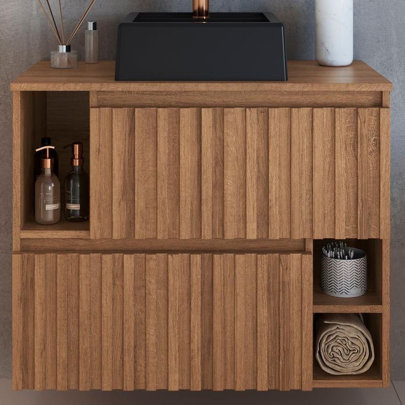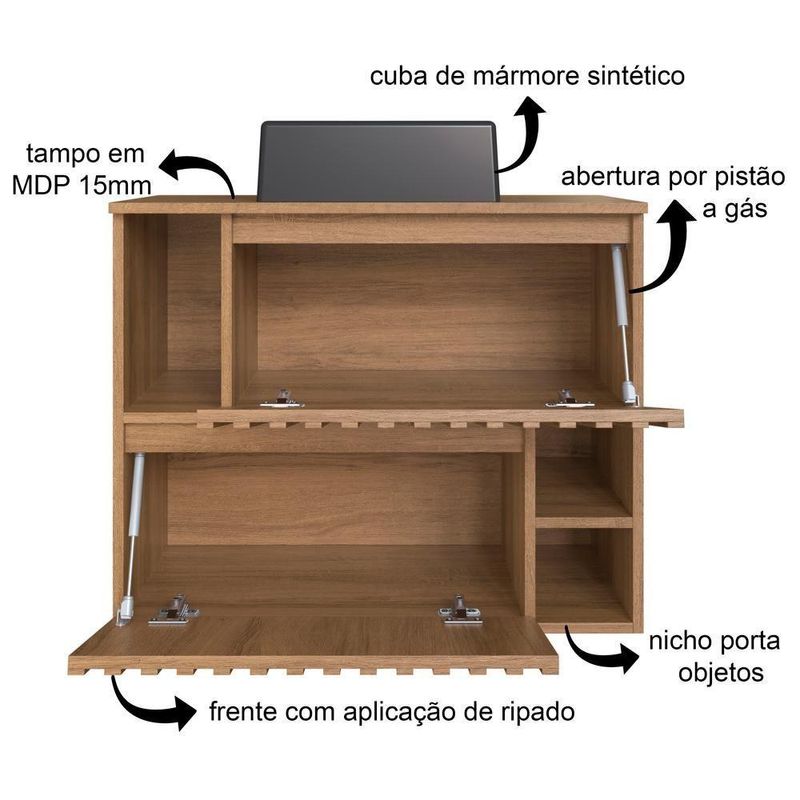 Características adicionais: Cuba em mármore sintético, balcão com 2 portas e ripado aplicado, abertura com pistão a gás, 3 nichos externos, dobradiças metálicas