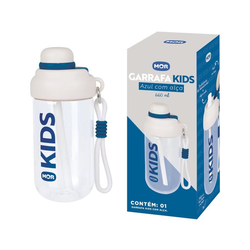 A Garrafa Kids Alça Azul 660 ml garante a hidratação da garotada na rotina do dia a dia. Na escola, em casa, ou durante brincadeiras e passeios, é uma companheira de grande utilidade, combinando eficiência e facilidade de uso.Possui alça removível, que facilita o transporte, e tampa em sistema de rosca. Além disso, conta com um canudo de silicone e polipropilenos e possui a estrutura em policarbonato transparente, que garante a visualização do líquido. A utilização é simples. Basta colocar a boca na abertura maior e puxar a bebida pela menor.Obs: lavar o produto de 1 a 2 vezes, com água ou detergente neutro na primeira utilização. Importante limpá-la e armazená-la seca para não acumular bactérias.