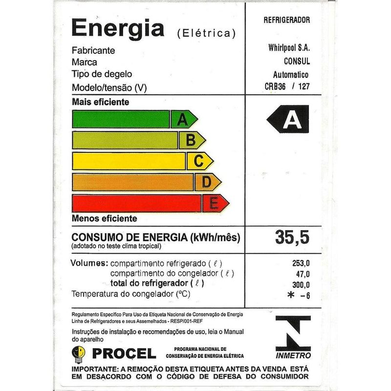 Alimentação Consumo de energia: 36,5 kwh/mês Consumo/Eficiência Energética: A