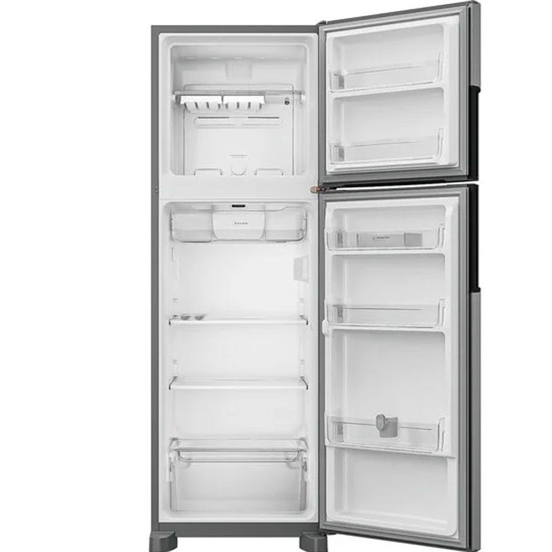 Material das prateleiras: Refrigerador: Prateleiras em vidro com acabamentos em plástico; Prateleira de porta, gaveta de legumes e cesto em plástico; Freezer: Prateleira do freezer e porta em plástico