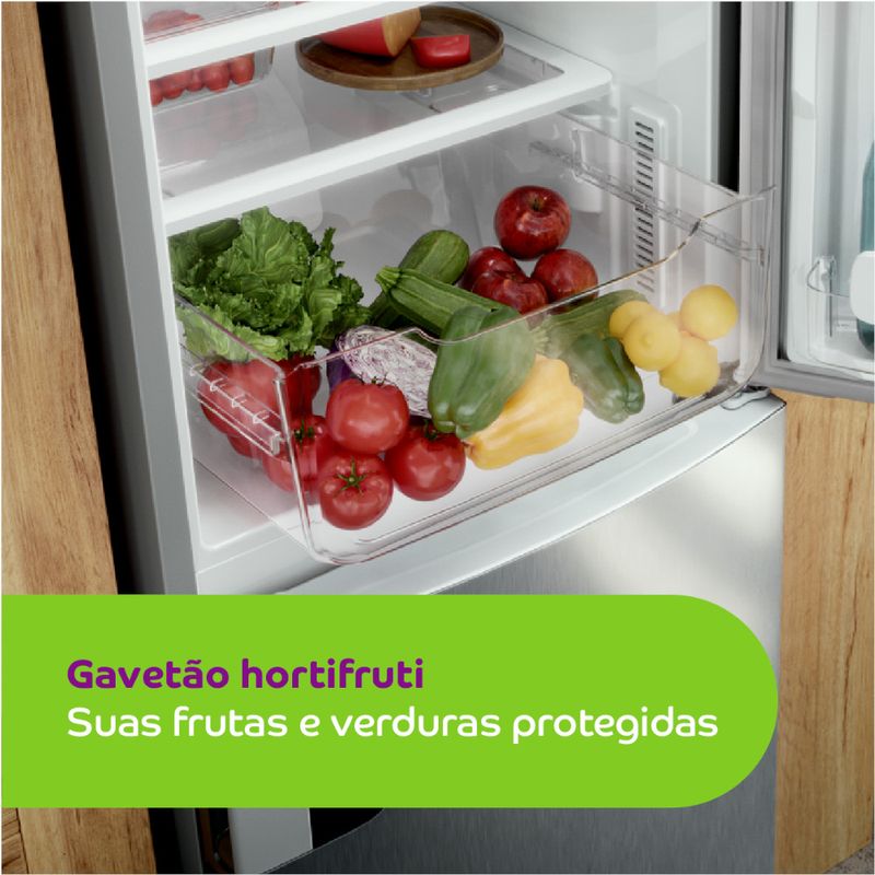 O gavetão agora está à altura das suas mãos no refrigerador, facilitando a organização e limpeza. Além de manter as frutas, verduras e legumes fresquinhos.