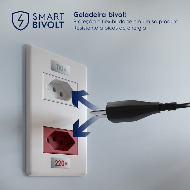 Além disso, a Geladeira Duplex IT70B está equipada com atecnologia SmartBivolt, que permite você conectar sua geladeira bivolt tanto na tensão (voltagem) 127V quanto na 220V. Com isso, você tem mais flexibilidade e maior resistência à oscilação de tensão4, garantindo que sua geladeira opere sem interrupções entre 90V e 310V e suporte picos de tensão de até 350V5.