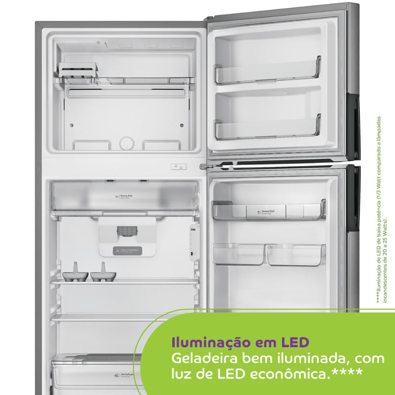 Geladeira bem pensada e bem iluminada, com luz de LED econômica* que ajuda a visualizar tudo que tem dentro de um jeito fácil e rápido.