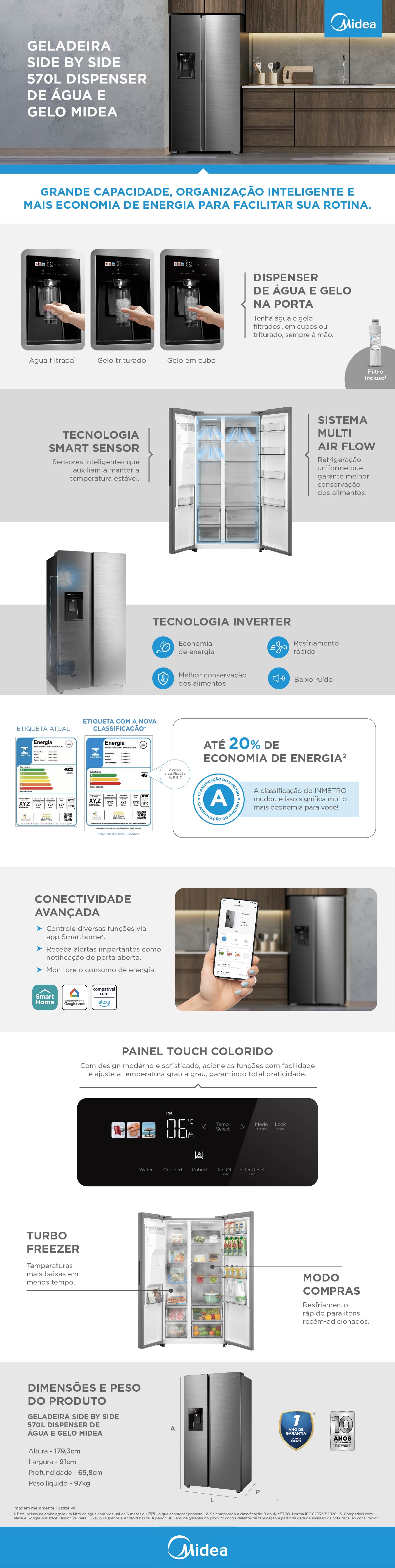Geladeira Side by Side Midea 570L Inox Dispenser Água e Gelo Inverter MDRS761MYD461