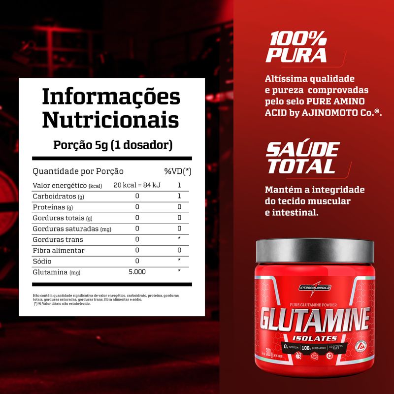 Glutamina Integralmédica é uma peça chave para quem procura melhorar seu sistema imunológico e digestivo. Com ação antioxidante, ajuda a diminuir o catabolismo muscular. Glutamine Isolates é um suplemento com formulação 100% pura, sem adição de aditivos artificiais, gorduras ou carboidratos. Zero glúten e sódio A glutamina é o aminoácido livre mais abundante no organismo. Podemos utilizar mais de 50% dessa glutamina livre quando realizamos programas de treinamento intensos ou volumosos, sendo indispensável que essa glutamina seja reposta no organismo para que suas funções biológicas sejam completas no nosso organismo. Glutamine Isolates Integralmédica tem altíssima qualidade e pureza comprovada através do selo PURE AMINO ACID by AJINOMOTO Co.® e está disponível nas versões de pote com 150 g e 300 g.