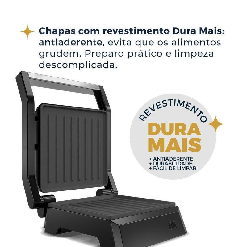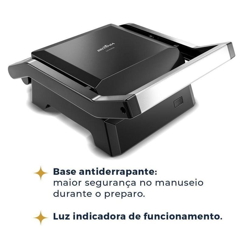 Transforme suas refeições em momentos especiais com o Grill Britânia BGR06A Dura Mais.Com abertura de 180 graus, você tem o espaço ideal para preparar hambúrgueres suculentos, carnes no ponto certo, sanduíches crocantes e muito mais. As chapas aquecem uniformemente, proporcionando uma tostagem perfeita em todos os lados, e o revestimento Dura Mais evita que os alimentos grudem, tornando o preparo e a limpeza mais simples. O acabamento em inox adiciona um toque de sofisticação à sua cozinha, enquanto a base aprimora garante total. Com 520W de potência, o Grill Britânia BGR06A é sinônimo de eficiência no seu dia a dia!Principais Características:- Placas onduladas com revestimento antiaderente
