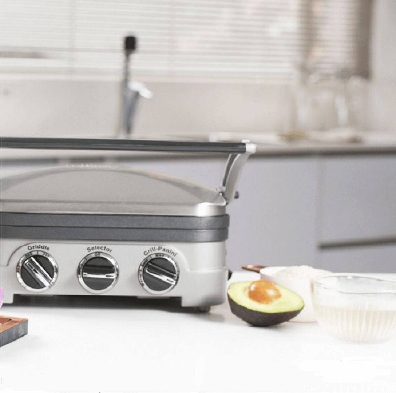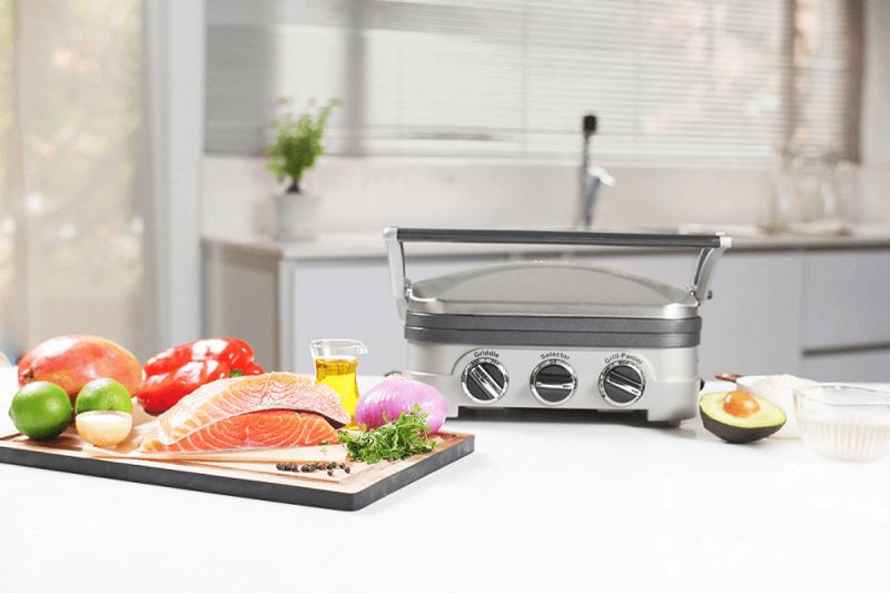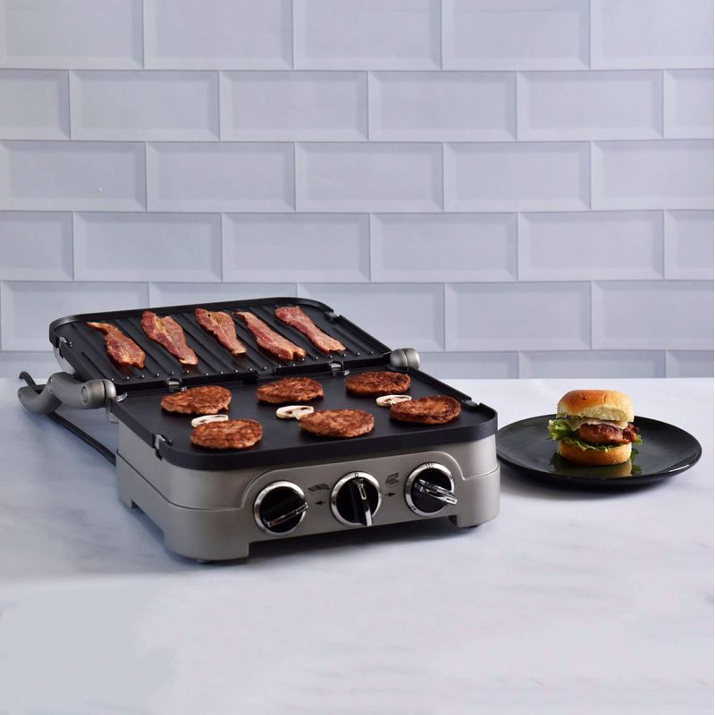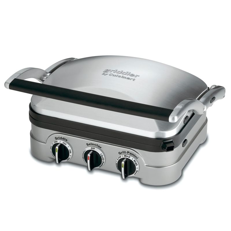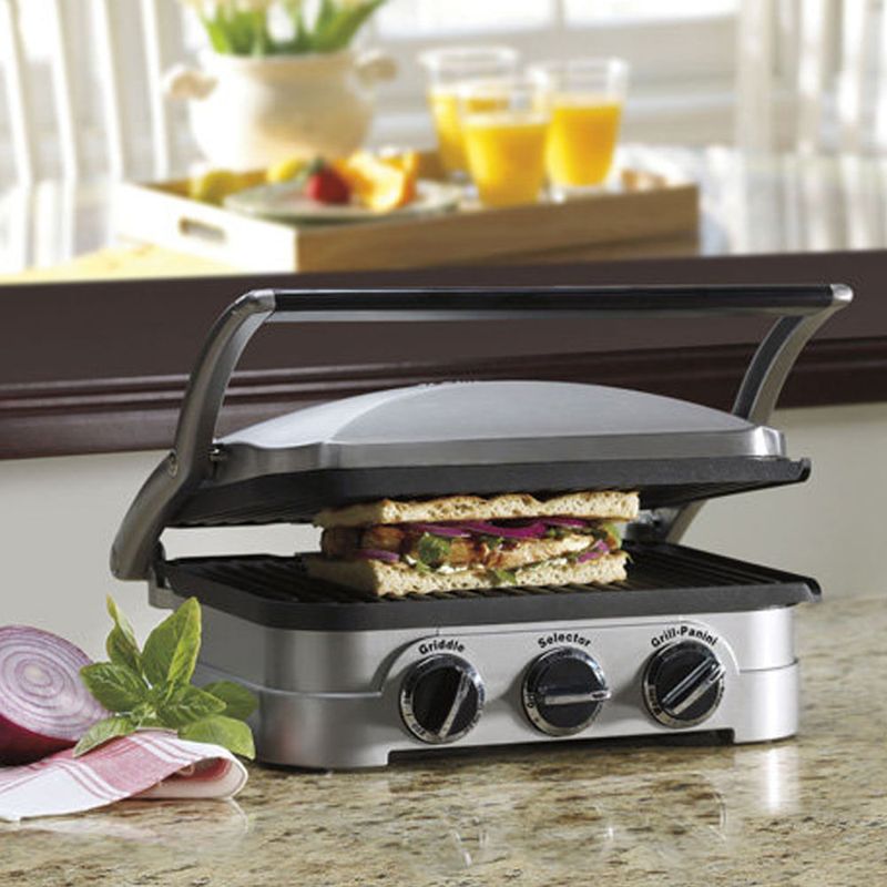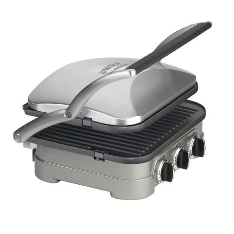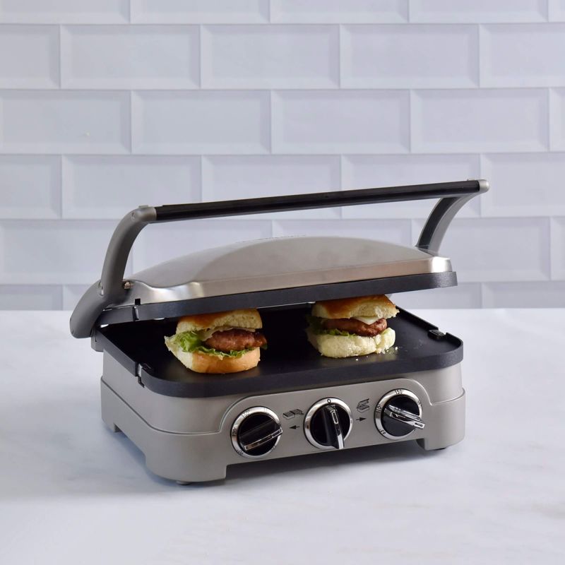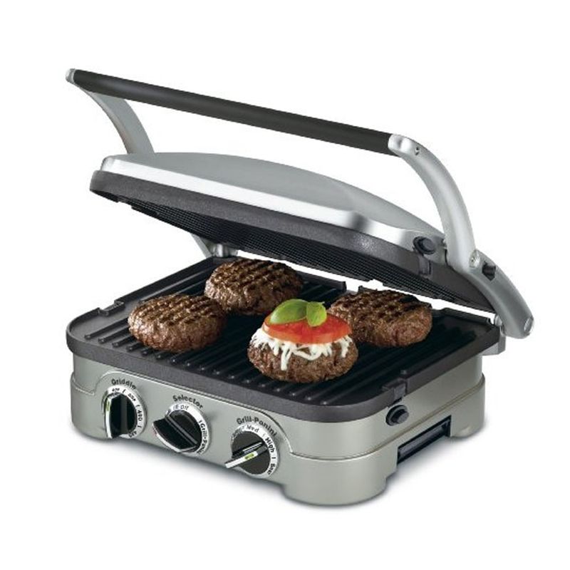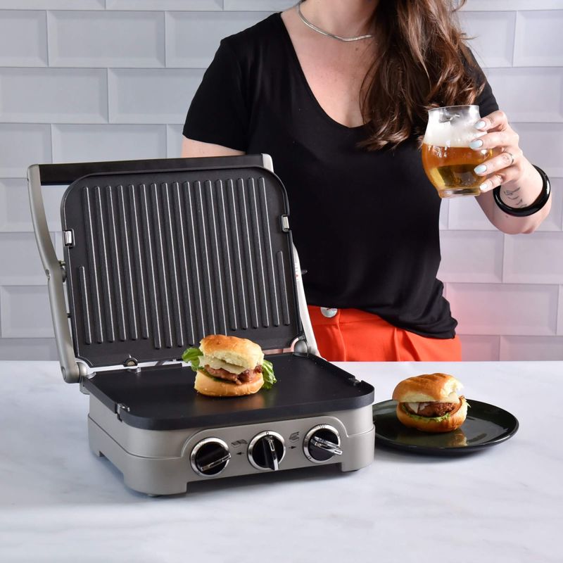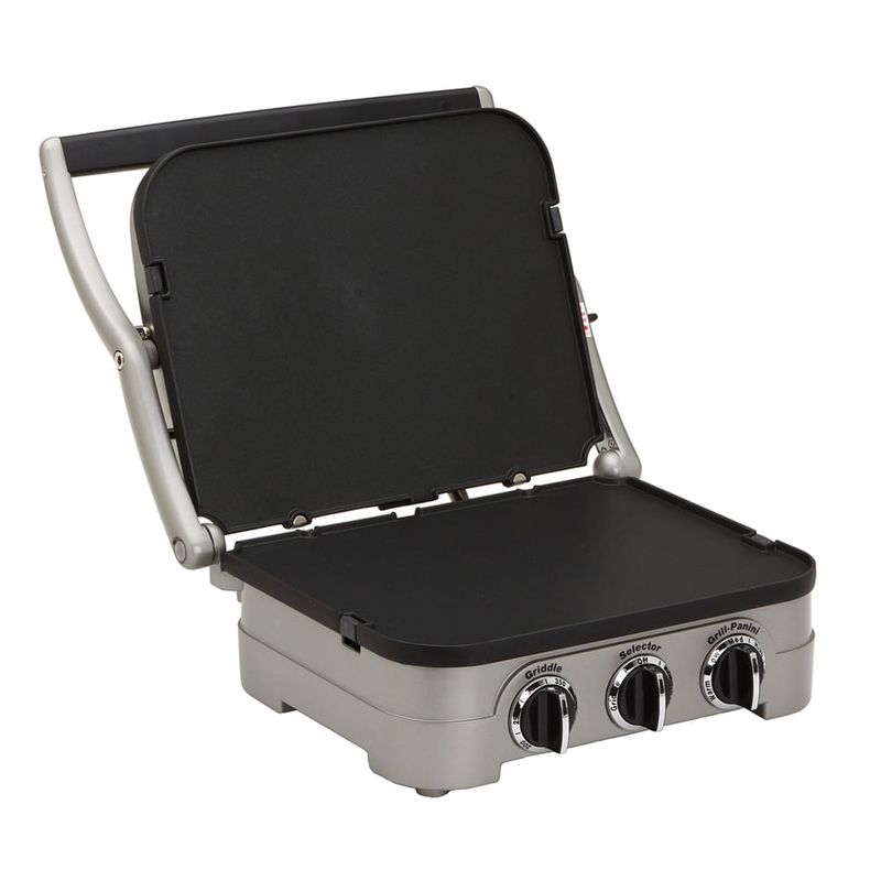 Produzido pela Americana Cuisinart com design clássico e moderno, este grill é extremamente leve. Ideal para o preparo de carnes, legumes, deliciosos paninis, fritar alimentos como ovos, bacon e outros. Conta com 1500W de potência, chapas antiaderentes e alça térmica que proporciona segurança e conforto durante o manuseio. O prático e compacto Grill Panini Cuisinart em aço inox possui um sofisticado acabamento cromado. Suas chapas antiaderentes se ajustam à altura dos alimentos e impedem a aderência no aparelho. Possui luzes indicadoras e temperatura pré estabelecida. Leve e fácil de transportar ou armazenar. O Grill Panini Cuisinart em aço acompanha espátula para a higienização.