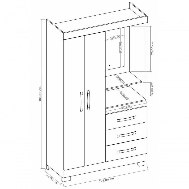 Ideal para os quartos com pouca área útil, o Guarda-Roupa Denali - MoveisAqui, é essencial para o seu quarto, por ser compacto se encaixa perfeitamente nesse ambiente. Possui um espelho, para dar aquela conferida no look, além de duas portas e três gavetas que contribuirão para a orgazição.Dimensões do Produto montado: