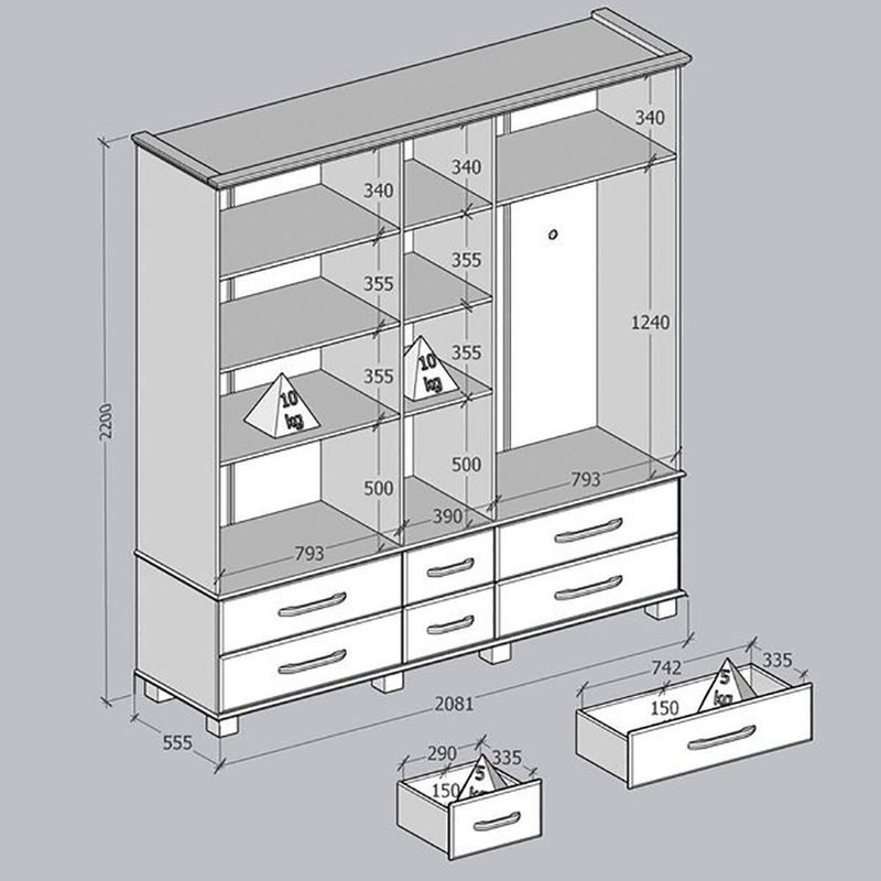 Peso Suportado: 10Kg em cada prateleira, 05Kg em cada gaveta, e 08Kg no cabideiro