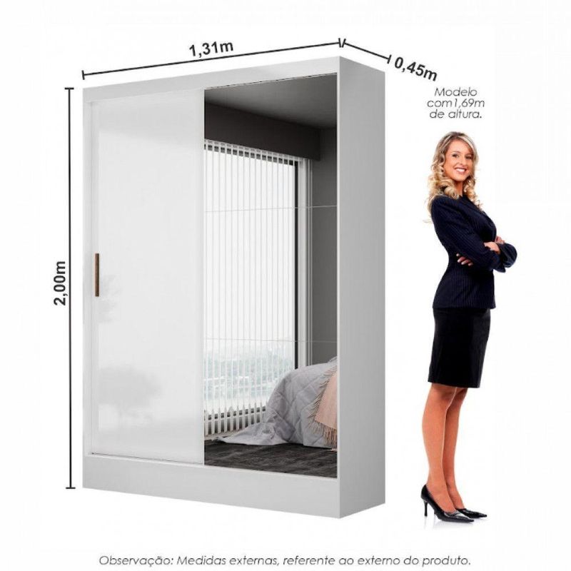 Com puxador em Madeira, possui 3 prateleiras interna, 2 portas correr, 2 gavetas internas com corredicas metalicas alem de amplo espaco para os cabideiros.